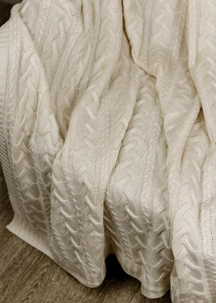 В'язаний однотонний плед ніжного кремового кольору з красивим рельєфним візерунком із кісками. Плед зробить інтер'єр затишнішим, подарує тепло та комфорт під час відпочинку. Плед виконаний із якісної акрилової пряжі, стане ідеальним аксесуаром для затишних вечорів вдома або для використання на відкритому повітрі.