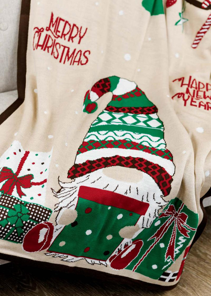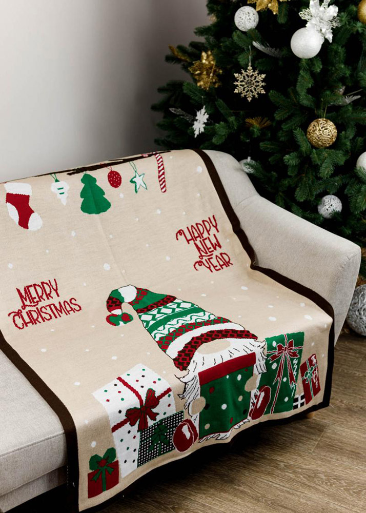 В'язаний плед прикрасить інтер'єр до Нового року та Різдва. Симпатичний малюнок із кумедним гномом і подаруночками подарує посмішку і святковий настрій, наповнить кімнату затишком. Плед забезпечить тепло і комфорт під час відпочинку, буде незамінним аксесуаром для затишних вечорів удома, а також для використання на відкритому повітрі. Плед виконаний з якісної та практичної акрилової пряжі.