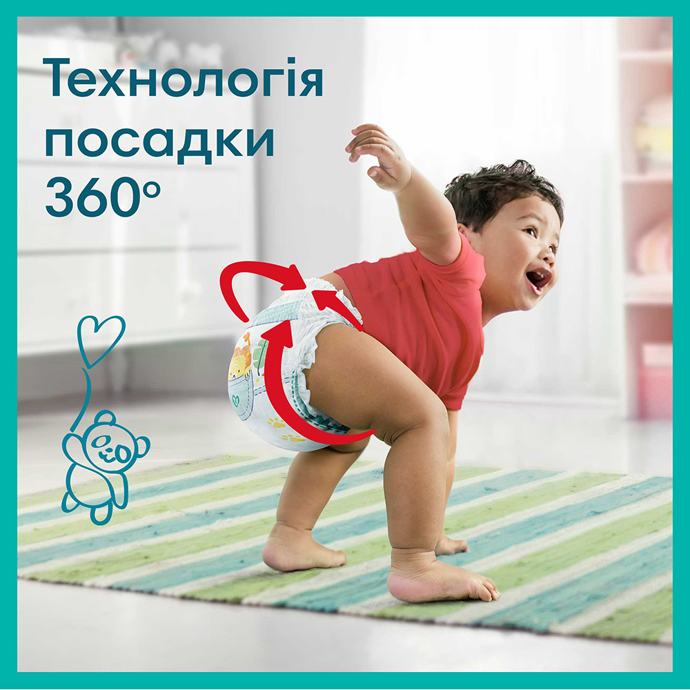 Трусики Pampers Pants допомагають запобігти протіканню і зберігають шкіру малюка сухою, гарантуючи йому міцний сон вночі. З технологією 360 Fit, де (1) еластичний поясок приймає форму тіла малюка, (2) суперабсорбуючий внутрішній шар миттєво поглинає вологу, а (3) подвійні манжети навколо ніжок надійно захищають від протікання.