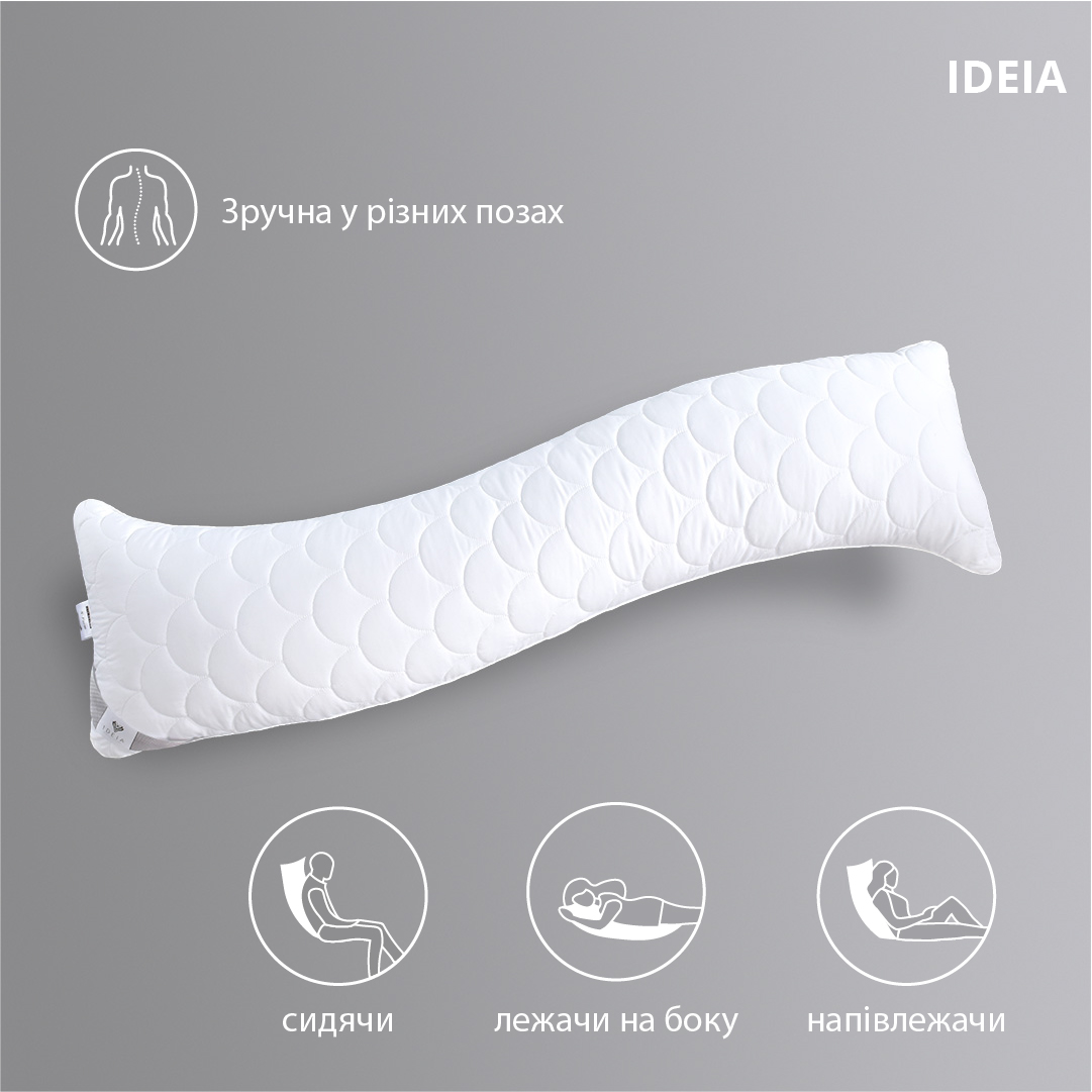 Подушка антиалергенна для сну S-Form Ideia 8-13255 біла. Велика та м’яка S-подібна подушка чудово підійде для обіймів. Має анатомічну форму з вигинами. Її можна обіймати, закидати на неї ногу, підкладати під спину, коли сидиш, вона підтримає шию або коліна. Підійде чоловікам і жінкам та дозволить зайняти найзручнішу позицію. Завдяки формі, подібній до букви S, є оптимальним рішенням для вагітних жінок. Подушка підтримає на всіх стадіях вагітності, а особливо в останньому триместрі. Подушка дозволить розслабитись та зайняти комфортну позу. Знімає напруження у м’язах. Подушку S-form можна розміщати різними способами для сну та відпочинку. Вона практична у догляді. Є можливість налаштувати висоту, наявна бокова застібка блискавка. Така подушка з легкістю впишеться в інтер’єр, буде зручна і для дивана, і для ліжка. Пошита з матеріалів, не здатних викликати алергію. На 100% безпечна для здоров’я людини. Добре тримає форму, є м’якою та пружною. Чохол подушки прикрашений ексклюзивним вистібом.