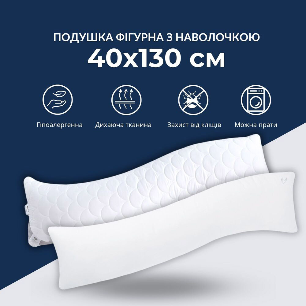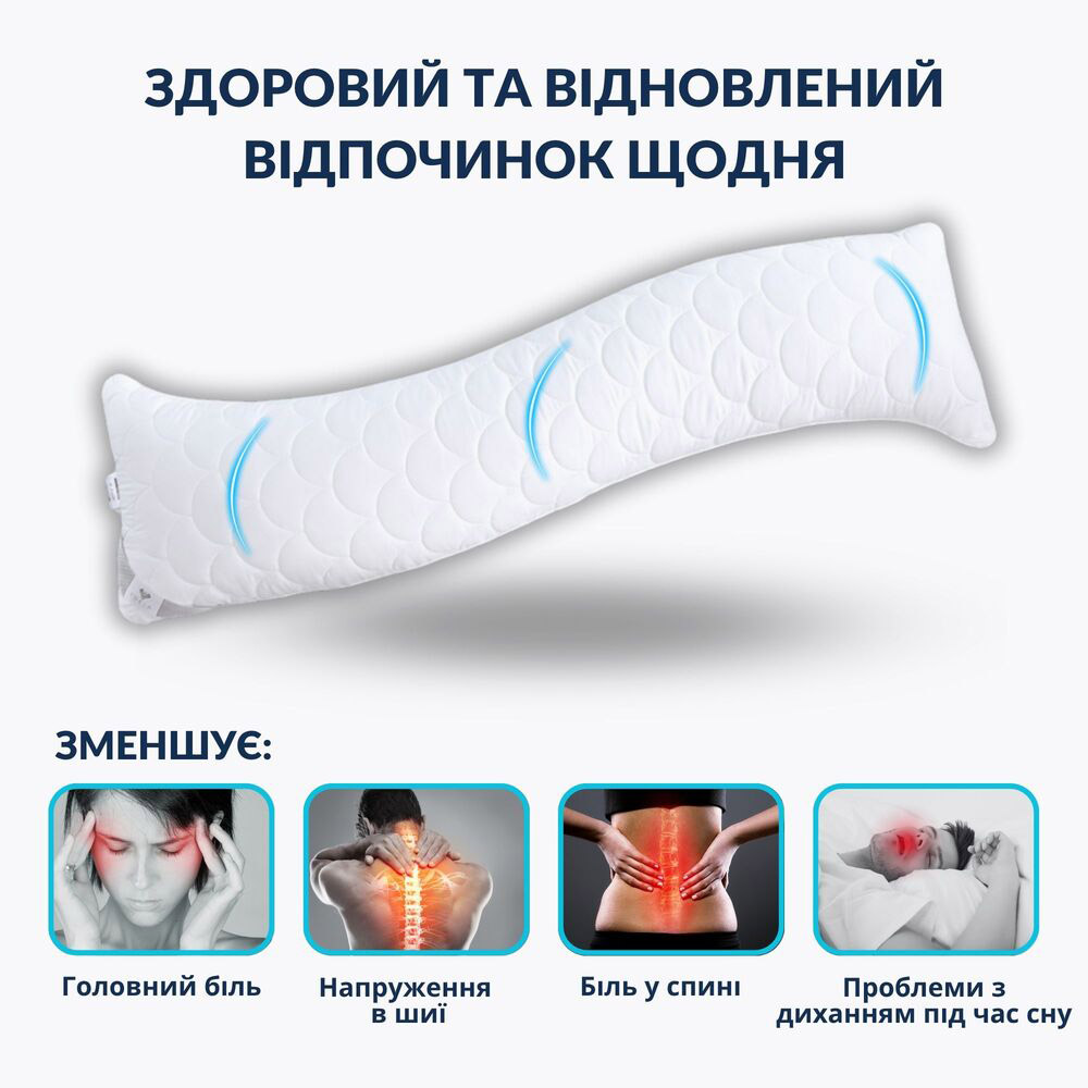 Подушка S-форми. Універсальний аксесуар із сатиновою білою наволочкою. Завдяки анатомічній формі подушка ідеально підходить для обіймів, підтримки тіла під час сну на боці або навіть як зручний опорний елемент під час читання або перегляду телевізора.