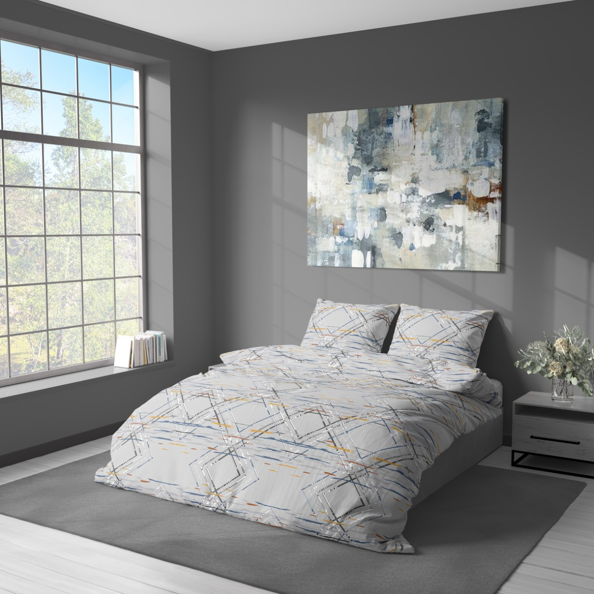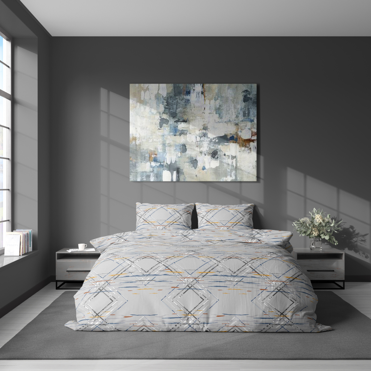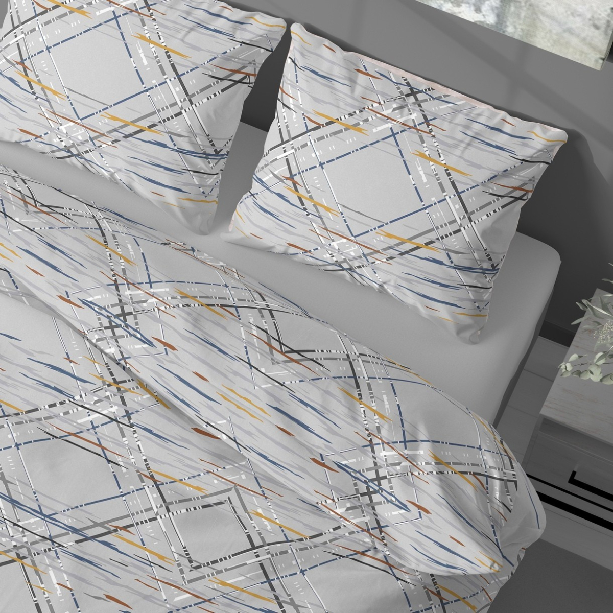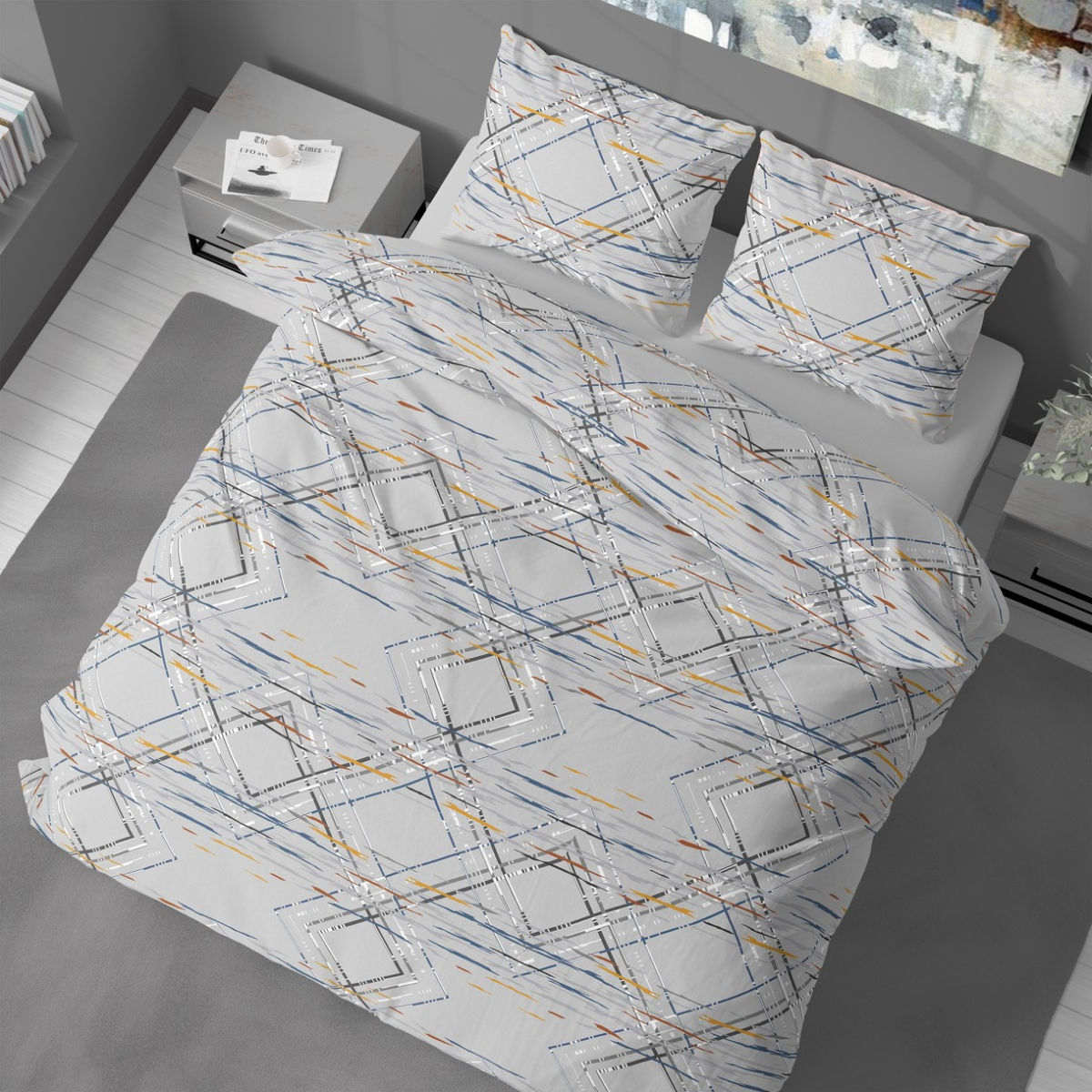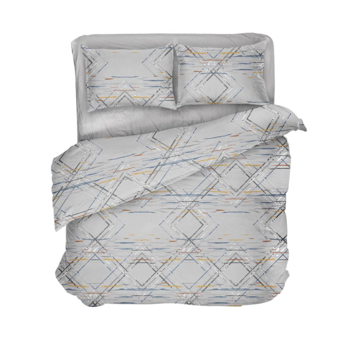 Постільна білизна сірого кольору з геометричними візерунками. Комплект чудово доповнить сучасний інтер'єр і стане стильним акцентом у спальні. Тканина з натуральної бавовни, високоякісна, з гладкою і м'якою текстурою, приємна на дотик, добре пропускає повітря, гіпоалергенна, забезпечує комфортний сон і відпочинок.