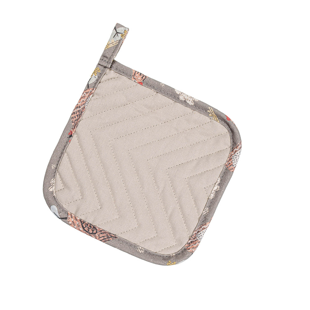 Прихватка кухонна Сhicken News Home Line. Кухонна прихватка квадратної форми, розміром 20×20 см, виготовлена з міцної тканини напівпанама (100% бавовна). Одна сторона сірого кольору з кумедним принтом курочок. Інша сторона однотонна, бежевого кольору.