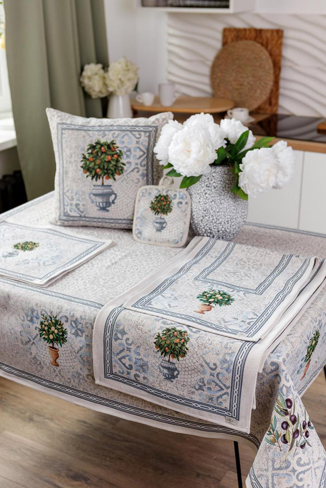 Квадратна прихватка зі зручною петелькою для підвішування. Гарний принт у середземноморському стилі з апельсиновим деревом і з візерунками чудово доповнить інтер'єр кухні. Якісна гобеленова тканина з бавовни та поліестеру прослужить вам довгий час, зберігши привабливий зовнішній вигляд.