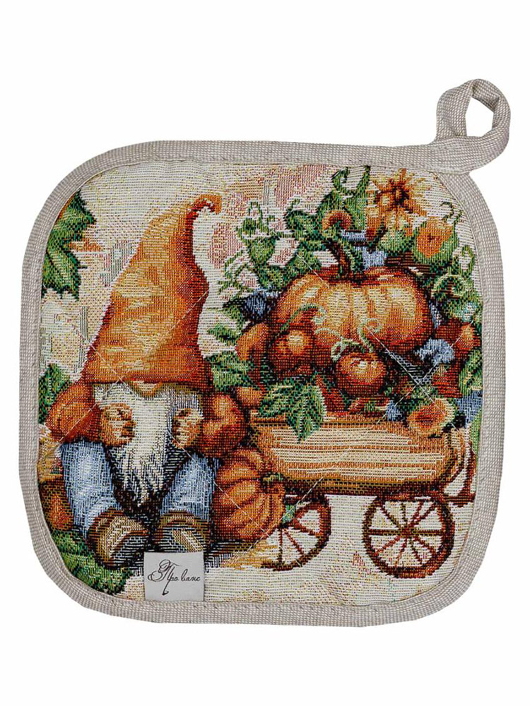 Квадратна прихватка зі зручною петелькою для підвішування. Гарний принт із гномом і гарбузами подарує посмішку і гарний настрій, чудово доповнить інтер'єр кухні. Якісна гобеленова тканина з бавовни та поліестеру прослужить вам довгий час, зберігши привабливий зовнішній вигляд.