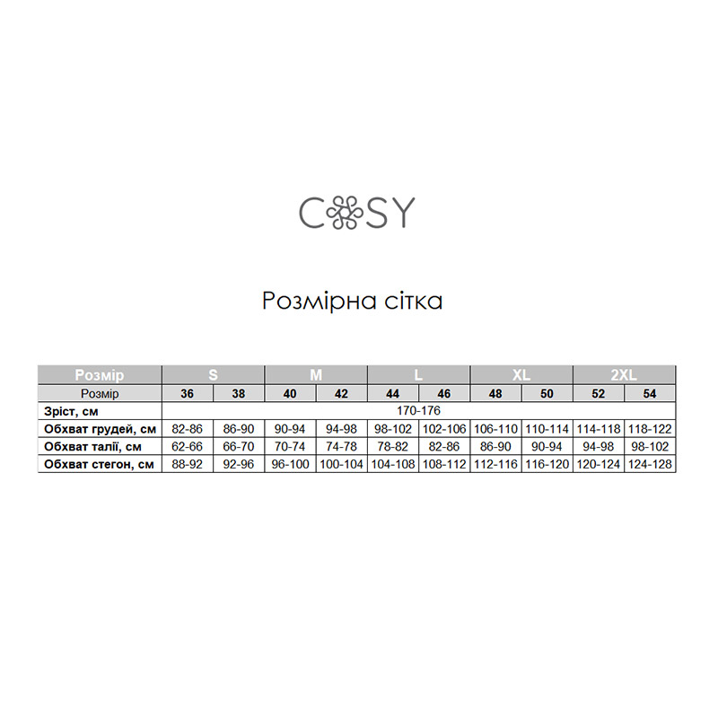 Розмір: S/M, L/XL COSY - український бренд одягу та текстилю для дому. Велика увага приділяється якості виготовлення кожної моделі. М'які натуральні тканини, сучасний лаконічний крій, старанність у деталях - усе це сприяє зручності та відчуттю затишку. COSY хоче привнести в повсякденне життя людей більше краси та комфорту. Ці товари для тих, хто любить свою сім'ю, своїх близьких, свій дім. COSY - затишок і комфорт щодня!