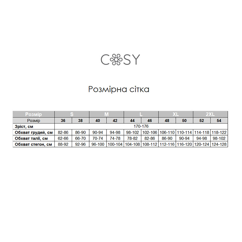 COSY - український бренд одягу та текстилю для дому. Велика увага приділяється якості виготовлення кожної моделі. М'які натуральні тканини, сучасний лаконічний крій, старанність у деталях - усе це сприяє зручності та відчуттю затишку. COSY хоче привнести в повсякденне життя людей більше краси та комфорту. Ці товари для тих, хто любить свою сім'ю, своїх близьких, свій дім. COSY - затишок і комфорт щодня!