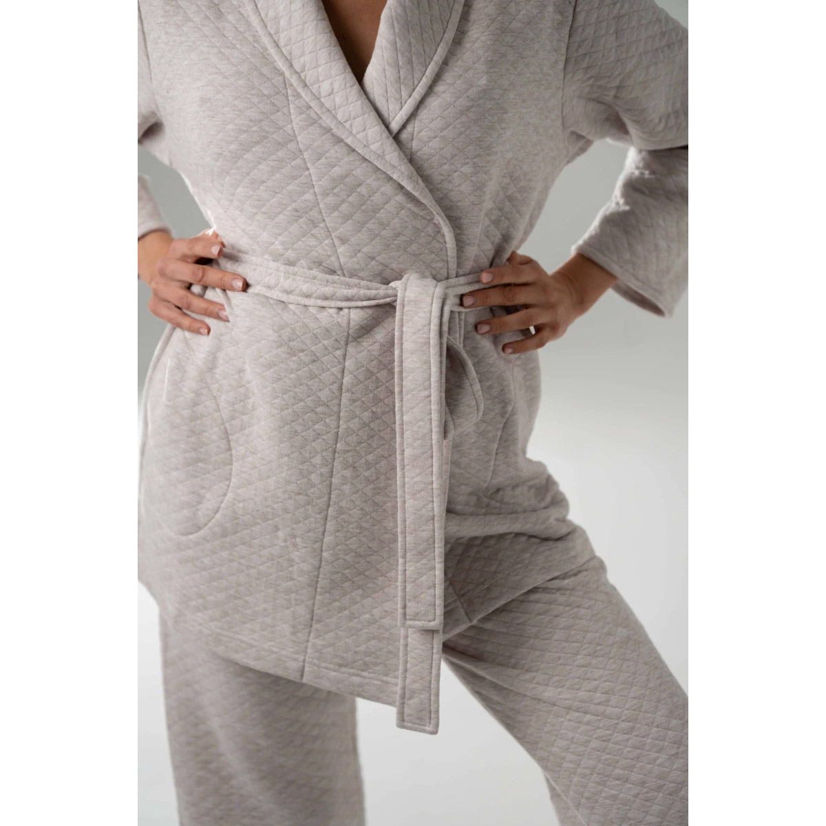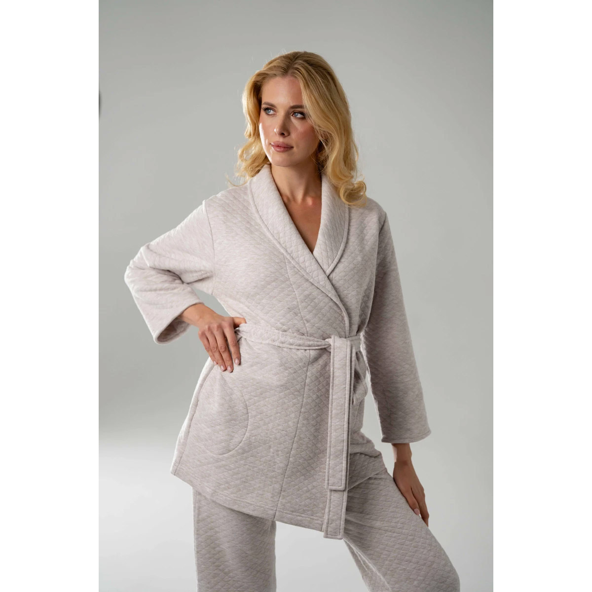 Домашній костюм з м'якого капітонію подарує тепло та комфорт у прохолодні дні. У комплект входять кардиган на запах із поясом та штани прямого крою. Щільна тришарова тканина приємна до тіла, добре зберігає форму та тепло. Ідеальний вибір для домашніх вечорів, відпочинку або повільних ранкових годин. Лаконічний дизайн та нейтральний колір легко комбінуються з іншими елементами гардеробу.