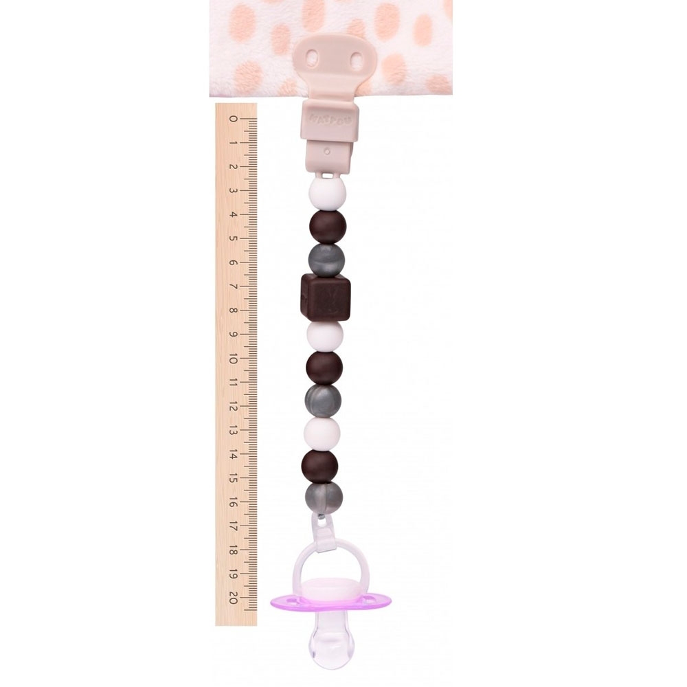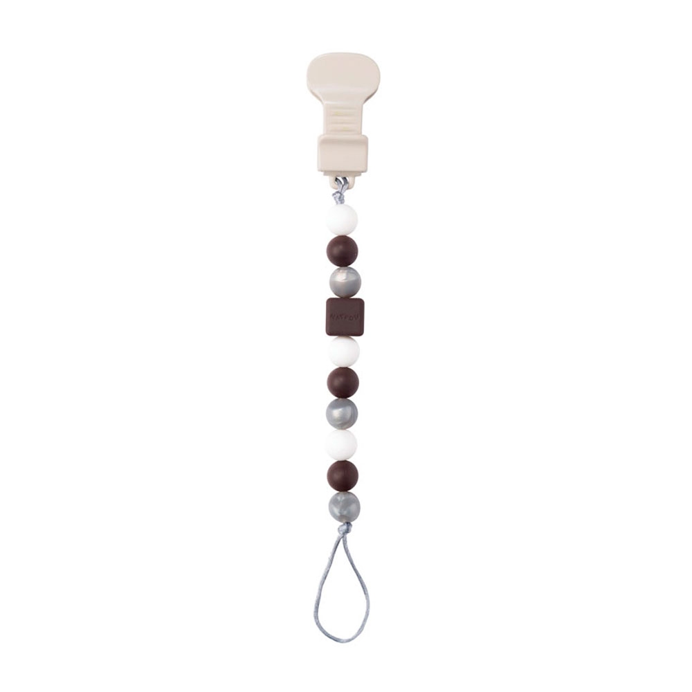 Тримач для пустушки Коричневий Nattou 878579 Стильна і функціональна річ, незамінна для кожної мами. Такий предмет, як утримувач для соски є одним з перших аксесуарів доповнює стиль і відображає індивідуальність вашої дитини. Крім дизайнерських особливостей виробник Nattou подбав і про функціональну частини, міцна кліпса із захисним покриттям не буде псувати одяг, довга кріпильна мотузочок дозволить закріпити її без праці на будь-який пустушки, а міцна основа запобіжить розривання всієї конструкції. Відмінністю цієї моделі є стильні силіконові бусинки. Їх можна мити, гризти, стерилізувати і вони не втратять своєї привабливості.