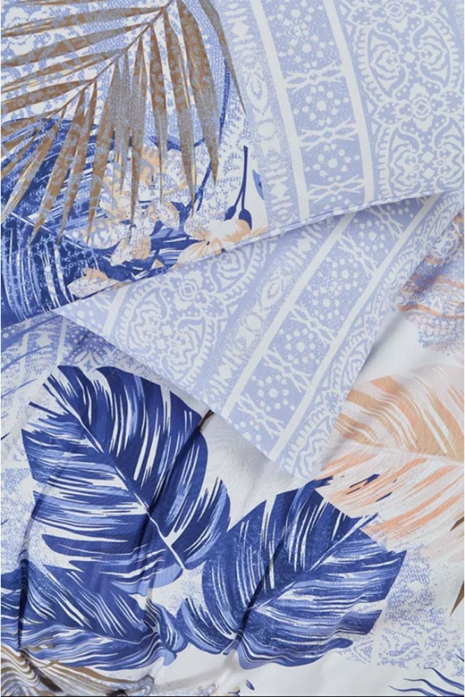 Постільна білизна з ранфорса - це ідеальне поєднання комфорту, якості та естетики. Комплект у синій колірній гамі з тропічним рослинним принтом, створює атмосферу гармонії й умиротворення. Якісна тканина з натуральної бавовни приємна на дотик, міцна і довговічна в експлуатації. Вона прекрасно пропускає повітря, гіпоалергенна, забезпечує комфортний і здоровий сон.
