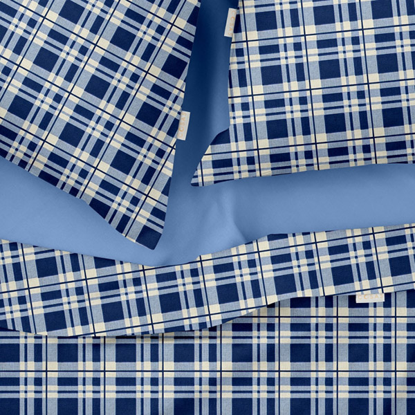 Постільна білизна з ранфорсу. Наволочки і підковдра синього кольору з класичним принтом в клітинку, простирадло однотонне темно-блакитного кольору.