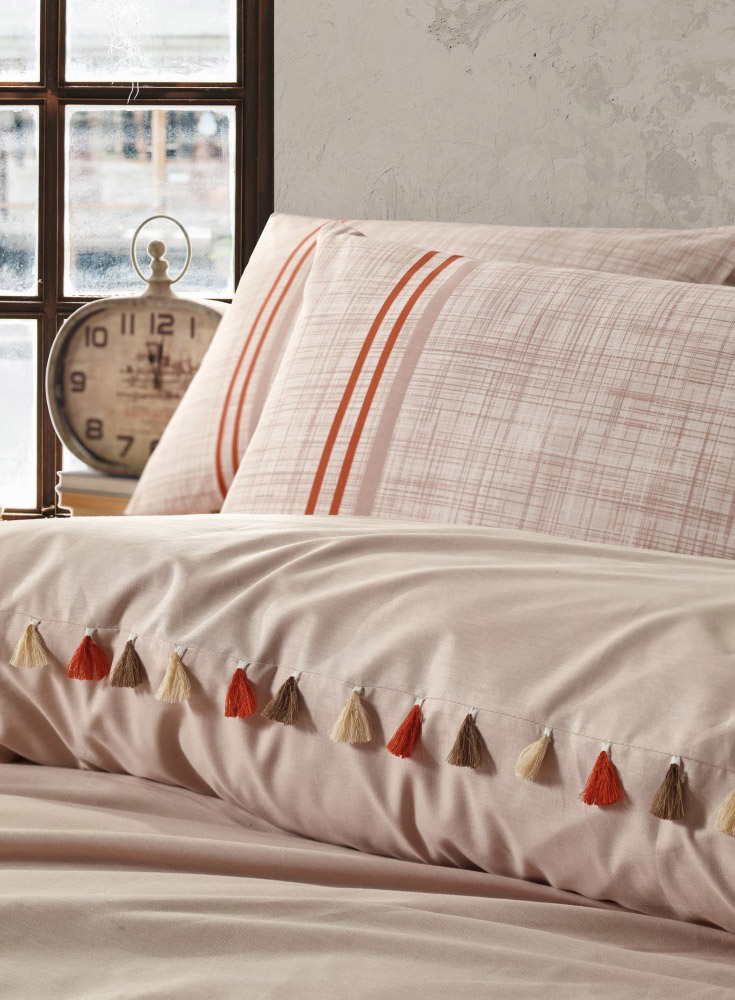 Постільна білизна бежевого кольору з декоративними китицями. Комплект виглядає дуже красиво та ніжно, наповнить інтер'єр атмосферою затишку та гармонії. Натуральна бавовняна тканина подарує максимально комфортний та приємний сон.