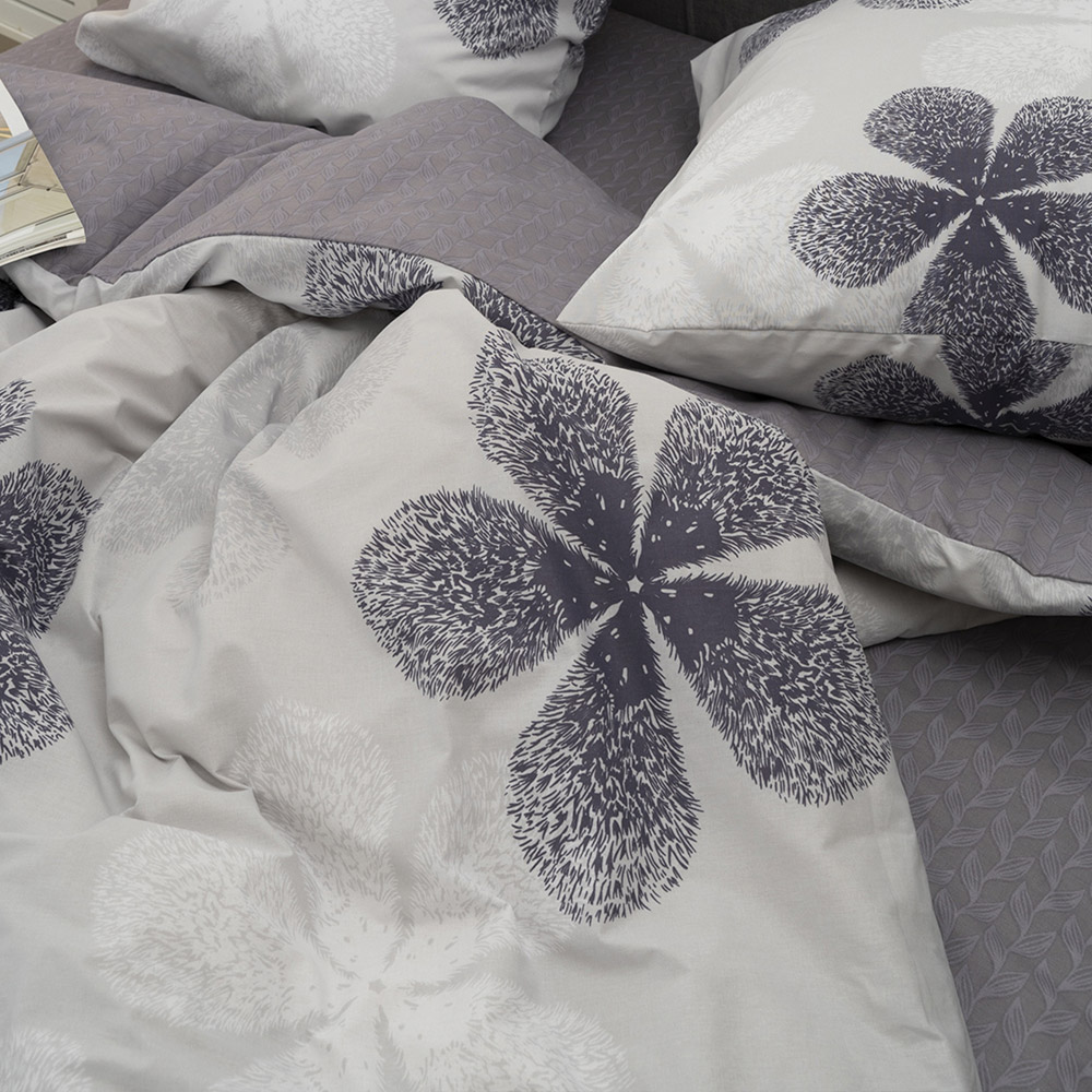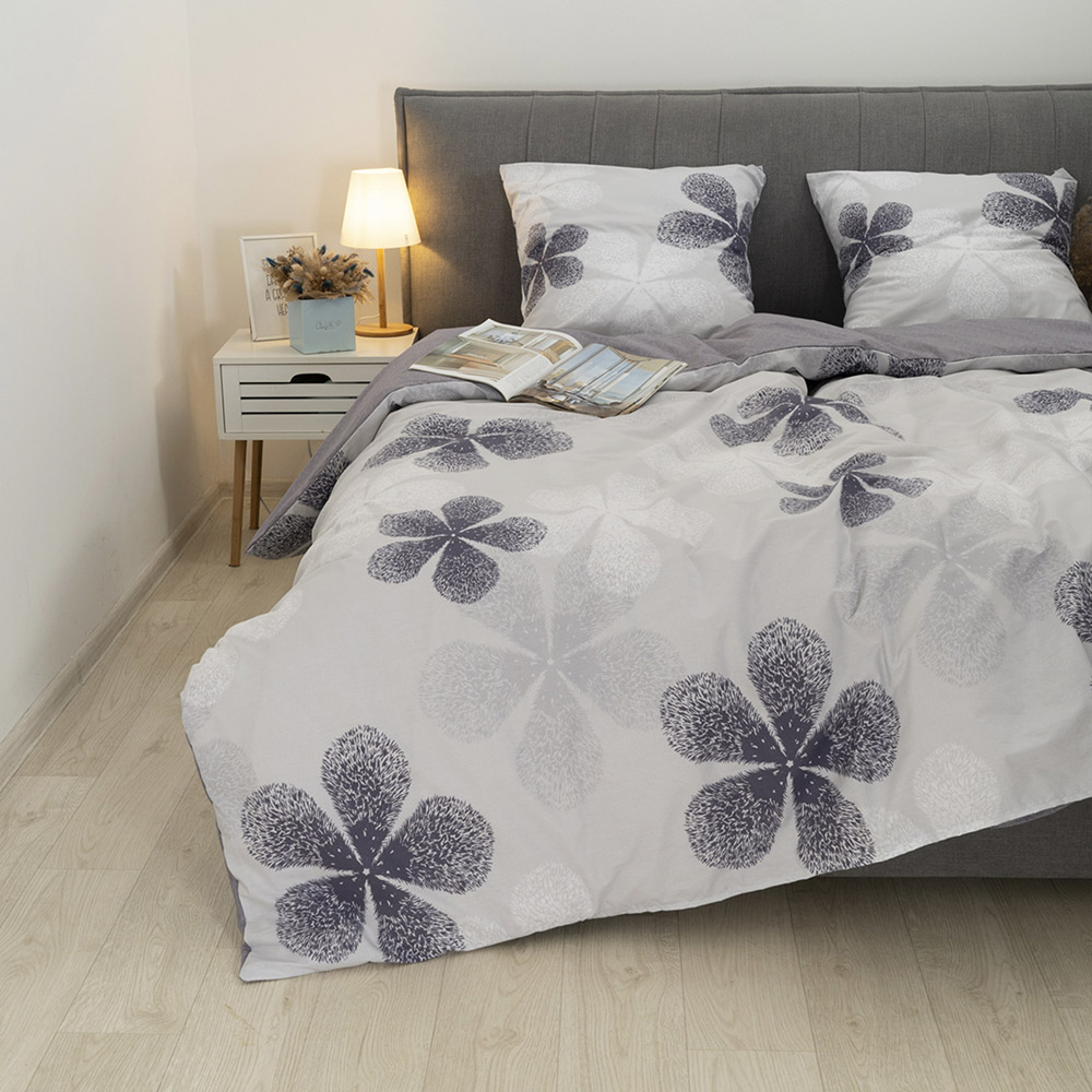 Постільна білизна з ранфорсу. Комплект сірих відтінків з квітковим принтом, створить в спальні атмосферу затишку. Якісна тканина з натуральної бавовни забезпечить комфортний і приємний сон, прослужить довгий час, зберігши привабливий зовнішній вигляд.