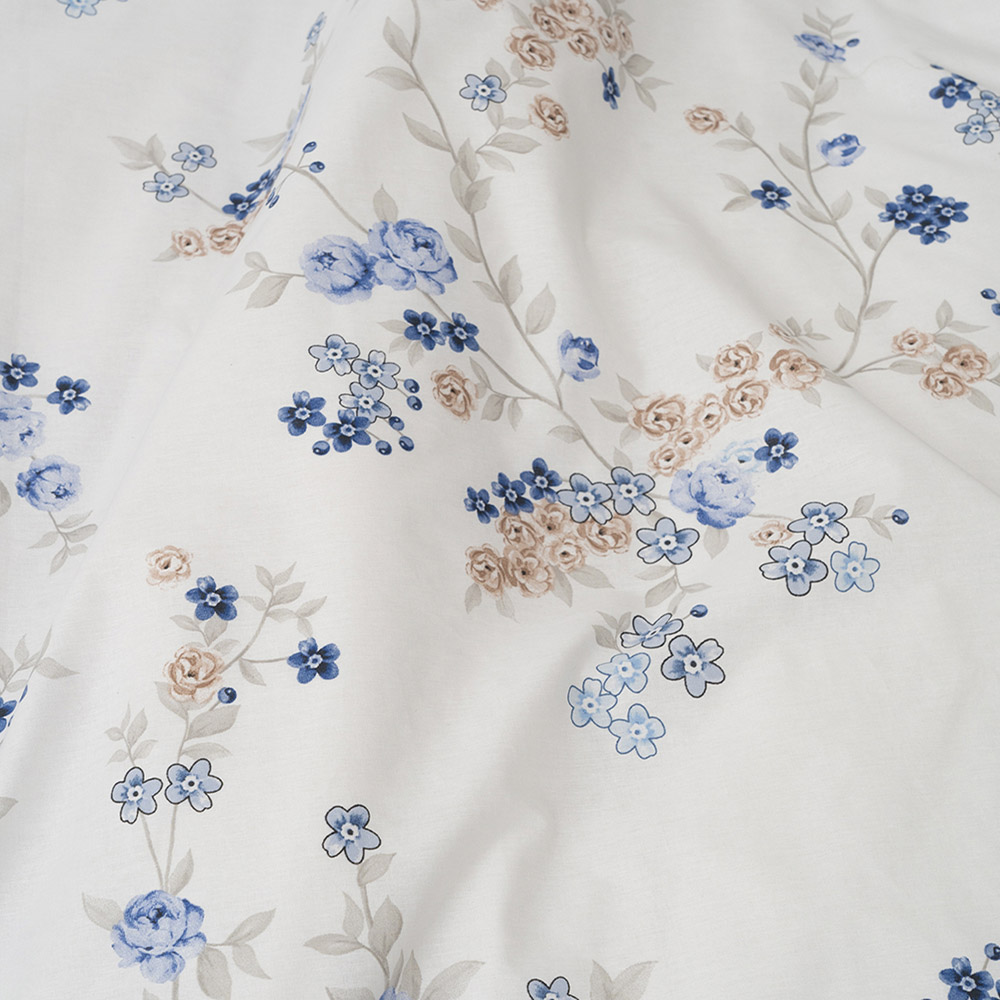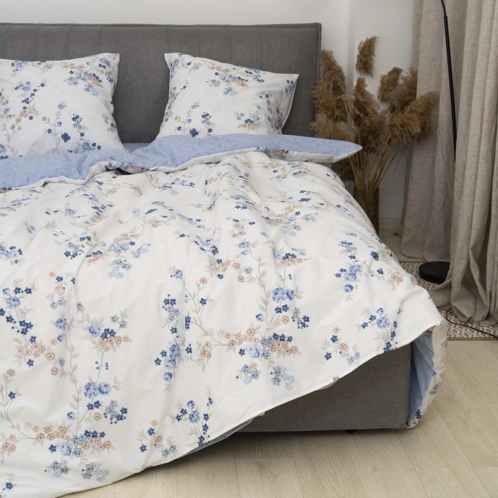 Постільна білизна з ранфорса. Комплект у біло-блакитному кольорі з красивим квітковим принтом, зробить спальню більш затишною. Якісна тканина з натуральної бавовни забезпечить комфортний і приємний сон, прослужить довгий час, зберігши привабливий зовнішній вигляд.