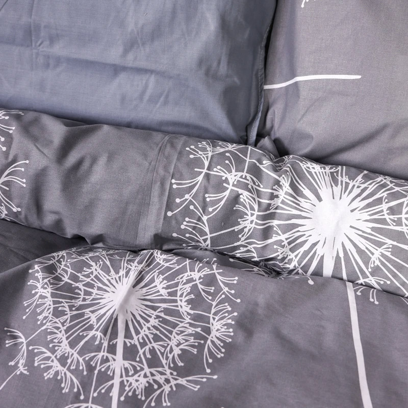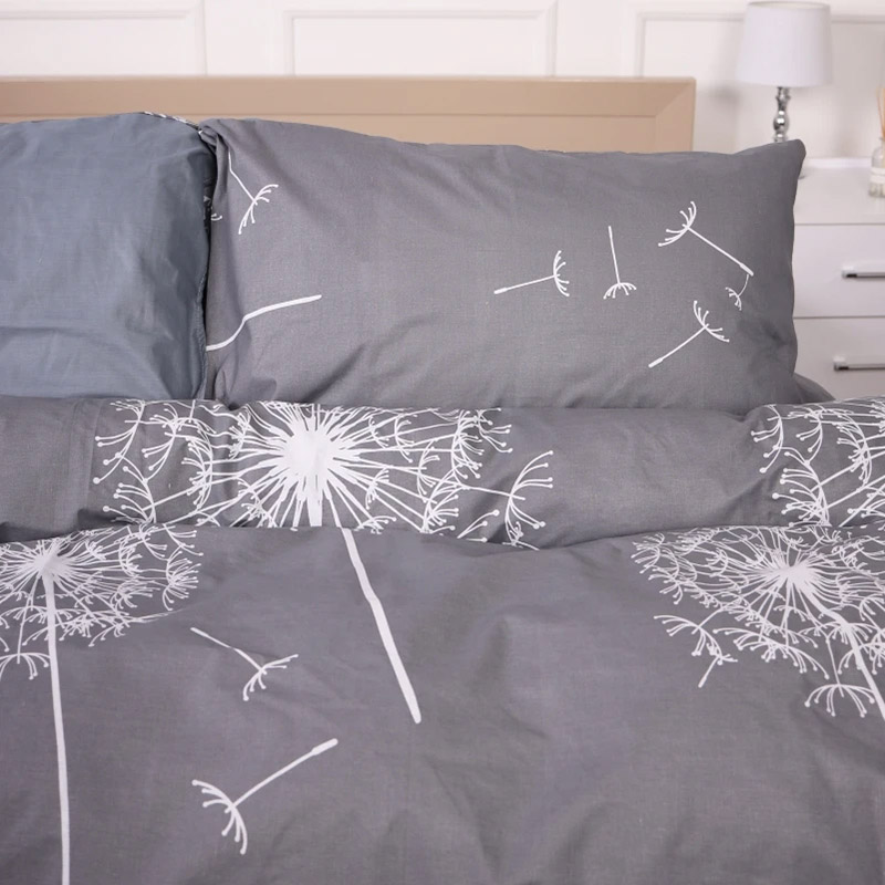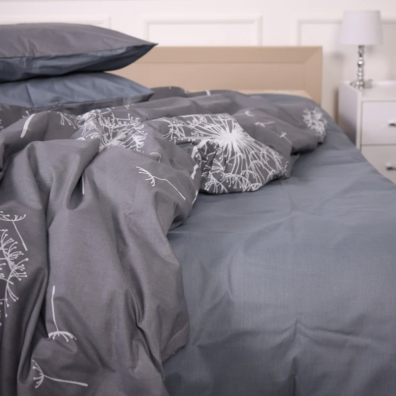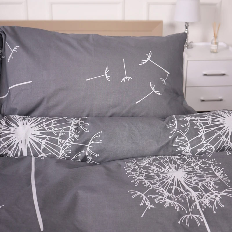 Якісна постільна білизна з ранфорса. Комплект сірих відтінків з красивим квітковим принтом з кульбабами, чудово доповнить інтер'єр і зробить спальню більш затишною. Натуральний бавовняний матеріал приємний на дотик, забезпечить максимально комфортний і здоровий сон. Комплект поставляється у фірмовій коробці, чудово підійде в якості подарунка для рідних і близьких.