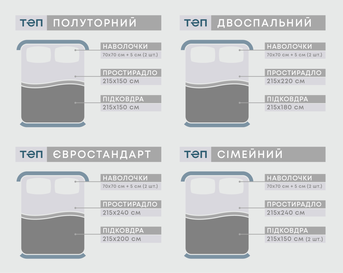 - Сімейний: підковдра 150х215 см - 2 шт, простирадло 215х240 см - 1 шт, наволочка 70х70 см - 2 шт