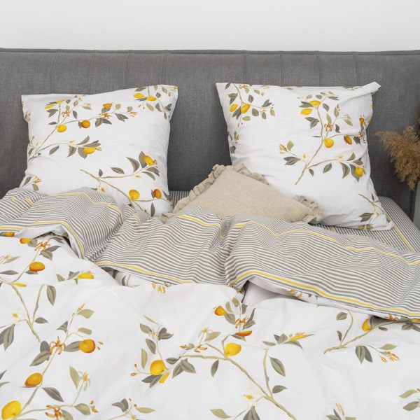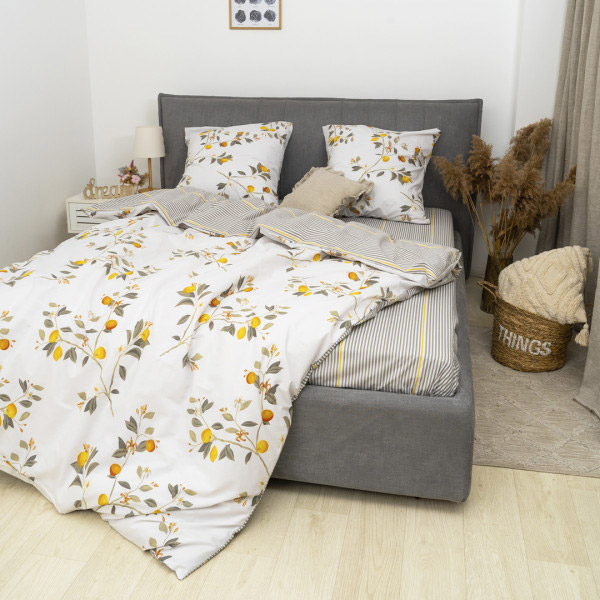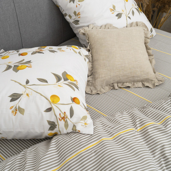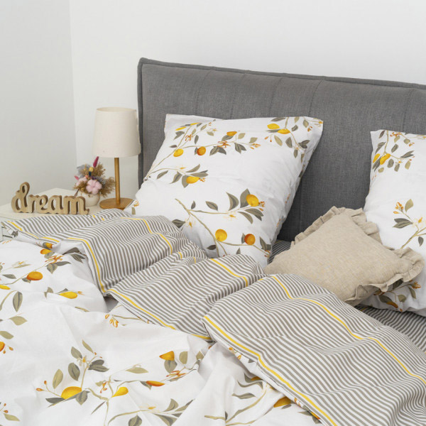 Постільна білизна з ранфорса. Комбінований дизайн гармонійно поєднує гарний рослинний малюнок на білому фоні та симпатичний принт із сірими й жовтими смужками, створюючи в спальні атмосферу затишку та гармонії. Якісна тканина з натуральної бавовни забезпечить комфортний і приємний сон, слугуватиме тривалий час, зберігши привабливий зовнішній вигляд.