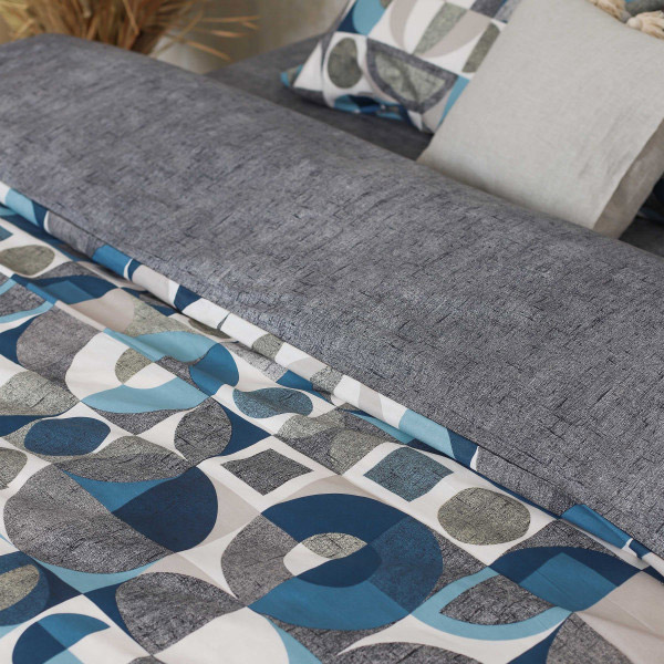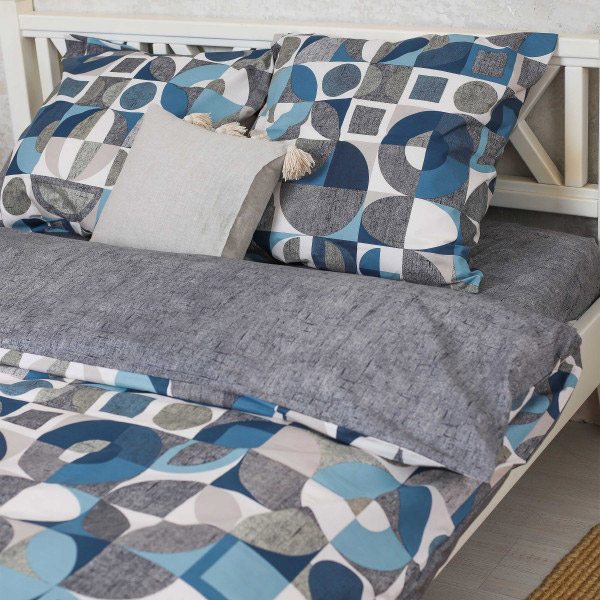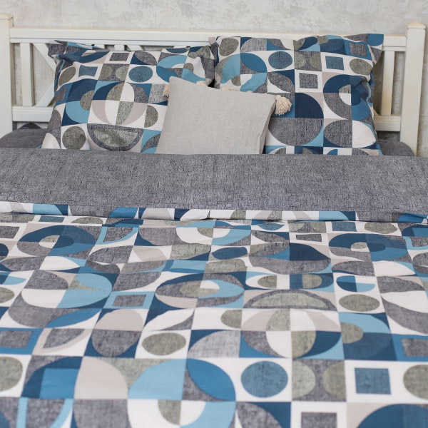 Набір сірих і блакитних відтінків з геометричними мотивами. Постільна білизна відмінно доповнить інтер'єр, стане гарним акцентом у спальні. Якісна тканина з натуральної бавовни забезпечить максимально комфортний та приємний сон.