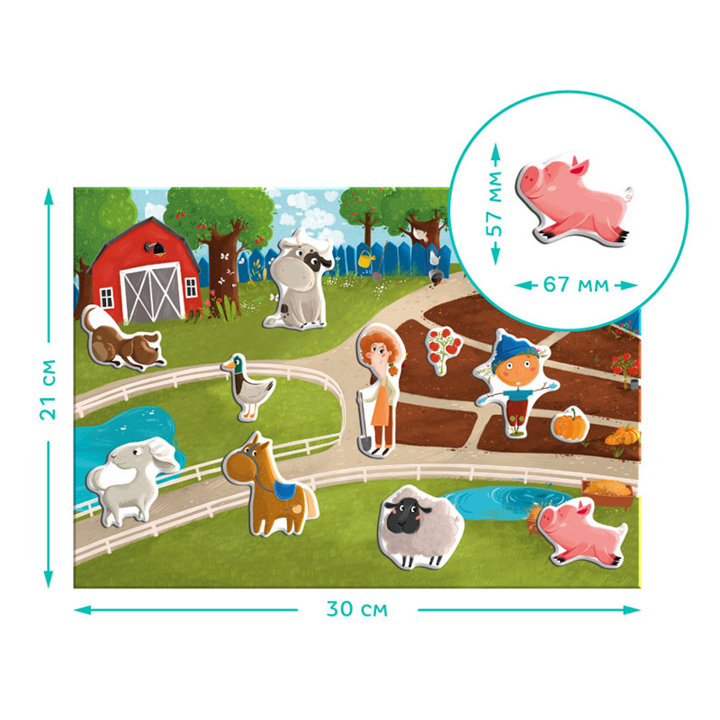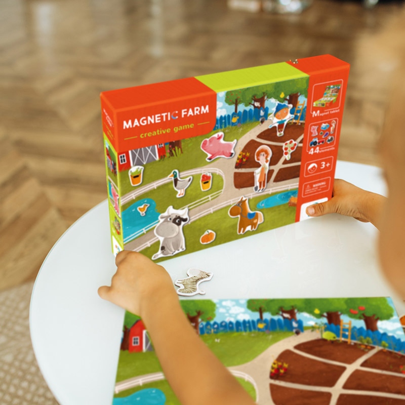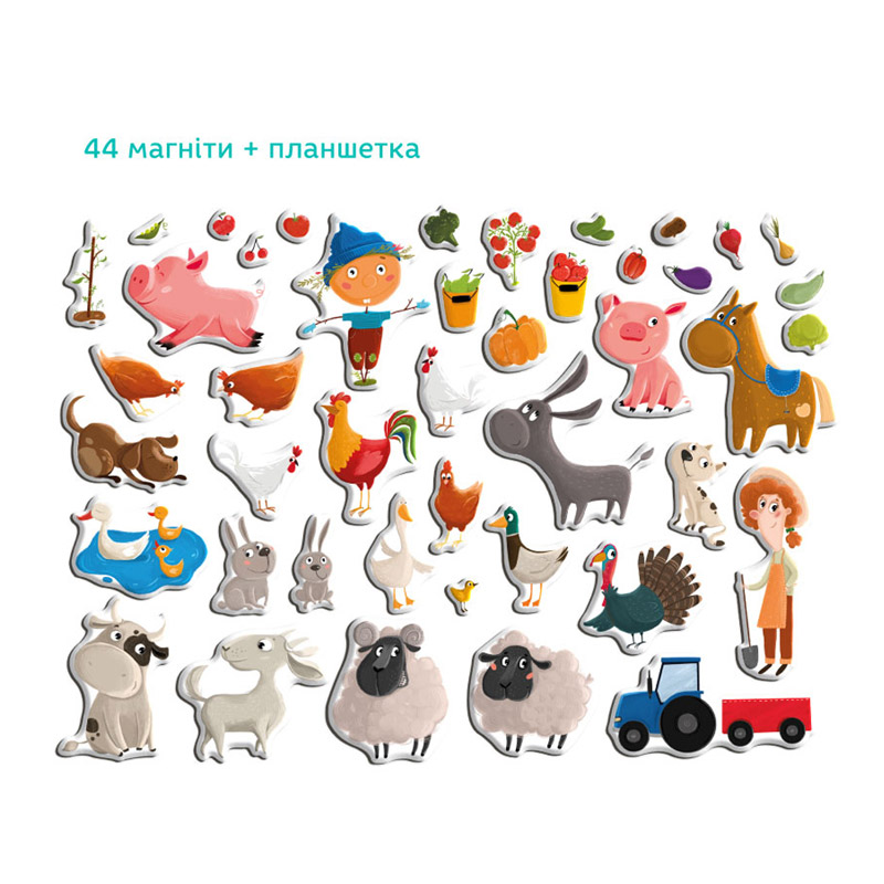 Сьогодні діток запрошують на ферму! Але це не будь-яка ферма, а особлива - магнітна. У розвиваючій грі від бренду Dodo включено магнітну планшетку, підставку під неї і 44 магніти з фермерськими тваринами. Малюки можуть розміщувати магніти на картинці, вивчати нові слова та вигадувати цікаві історії про життя на фермі. Де може бути загублене каченятко? Які овочі виростають на грядці, і чи весело живеться садовому опудалу?