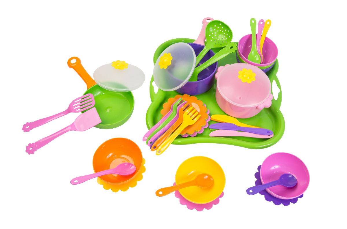 Набір іграшковогопосуду столовий "Ромашка" 43 елемента від українського виробника Тигрес містить все, що може надихнути майбутніх господинь і шеф-кухарів на кулінарні подвиги. Використовуючи каструлю, 2 сковорідки, 2 лопатки і шумівку, можна готувати цікаві страви. Ручки зі сковорідок знімаються, перетворюючи їх в зручні форми для випічки. За допомогою ополоника можна розливати страви в тарілки і миски гостей. Ложки, вилки і ножі дозволять в ігровій формі вивчити правила сервірування столу. Піднос зробить подачу страв більш зручною. Іграшкова посудка Ромашка виготовлена з безпечної харчової пластмаси і підходить для використання в мікрохвильовій печі і посудомийній машині. Набір представлений у великій і привабливій картонній коробці, що робить його дуже презентабельним подарунком. Складається з 43 елементів. Упаковка - коробка.