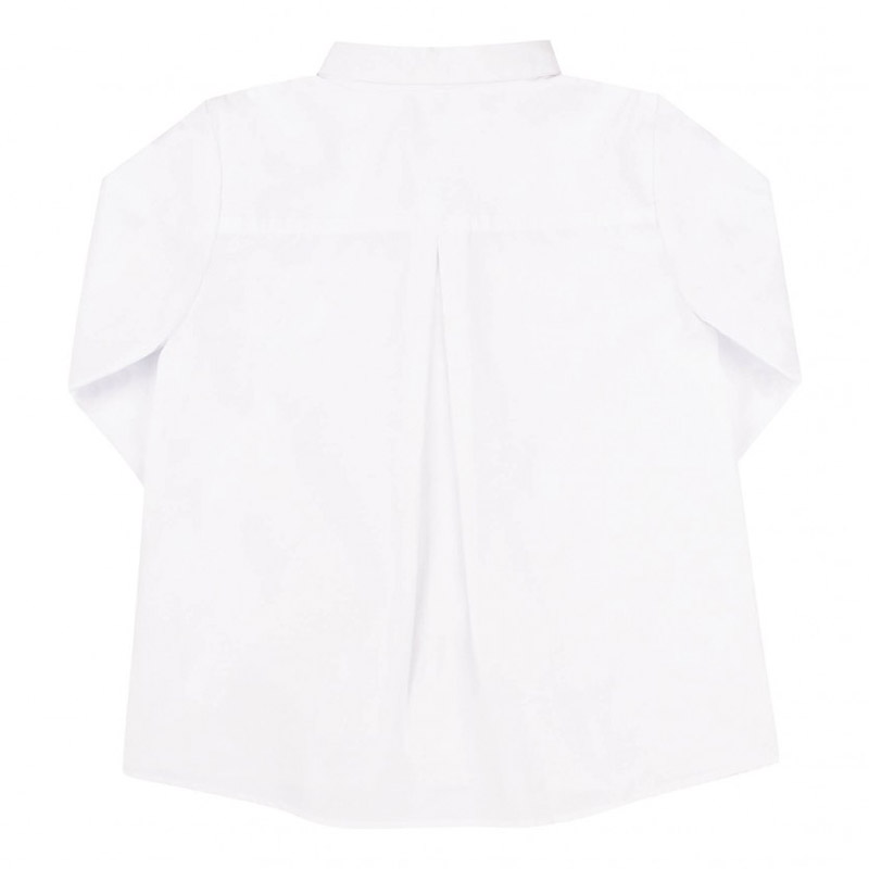 Сорочка білого кольору. Модель класичного крою, прямого силуету, з коміром, спереду застібається на ґудзики. На грудях - дві накладні кишені. Рукава довгі, на манжетах із ґудзиками. Спинка з кокеткою і центральною складкою.