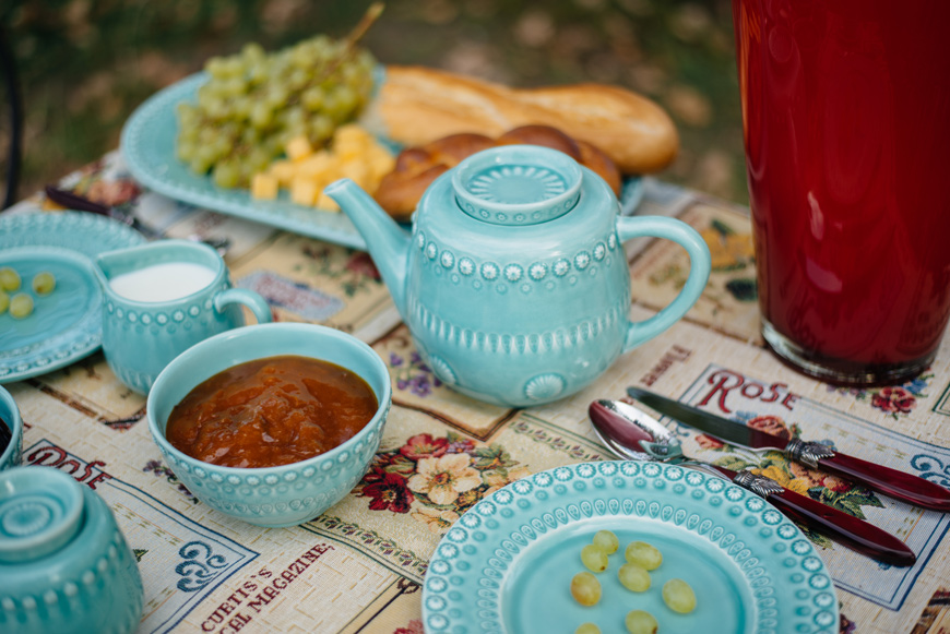 Молочник відомого португальського бренду Bordallo Pinheiro виготовлений з якісної кераміки найвищого ґатунку в стилі майоліка. Розфарбований вручну в бірюзовий колір і декорований фантазійним візерунком з дрібних ромашок. Вся поверхню виробу блищить і сяє завдяки покриттю вологостійкої глазур'ю. Міцну кераміку спокійно можна мити в посудомийній машині і ставити в мікрохвильову піч.