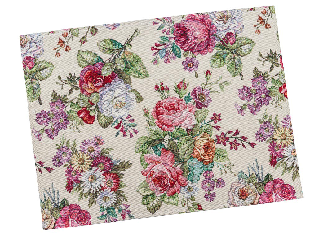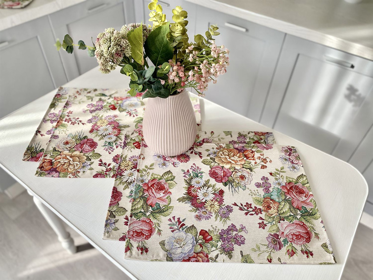 Гобеленова серветка з гарними квітковими мотивами чудово доповнить сервірування святкового столу. Серветка виконана з якісного та щільного гобелена, прослужить вам довгий час, зберігши привабливий зовнішній вигляд та первинний колір.