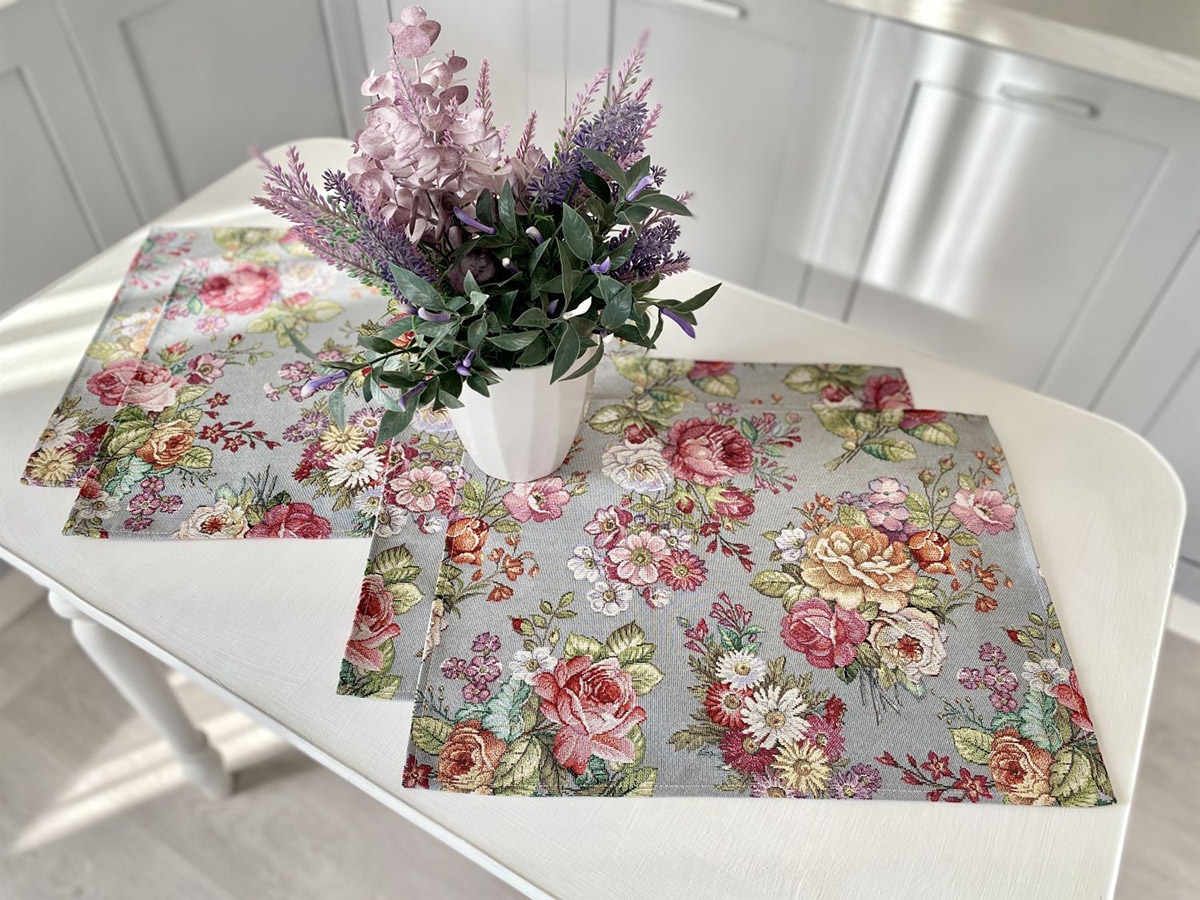 Красива гобеленова серветка сірого кольору з елегантним квітковим малюнком. Серветка чудово доповнить сервірування святкового столу. Щільна якісна тканина прослужить вам довгий час, зберігши привабливий зовнішній вигляд та первинний колір.
