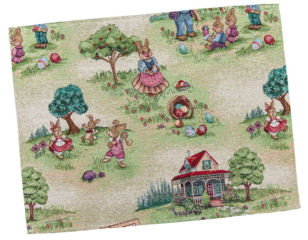 Гобеленова серветка зелених відтінків. Малюнок із кумедними кроликами та писанками стане прикрасою святкового столу, наповнить кімнату затишком. Міцна та якісна іспанська тканина прослужить вам довгий час, зберігши привабливий зовнішній вигляд та насичений колір.