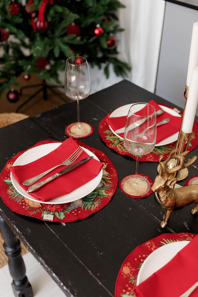 Кругла серветка червоного кольору з красивим зимовим малюнком. Серветка чудово доповнить сервірування столу до Нового року або Різдва, наповнить інтер'єр атмосферою затишку і свята. Серветка виконана зі щільного якісного гобелена на основі бавовни та поліестеру з мерехтливими нитками люрексу.