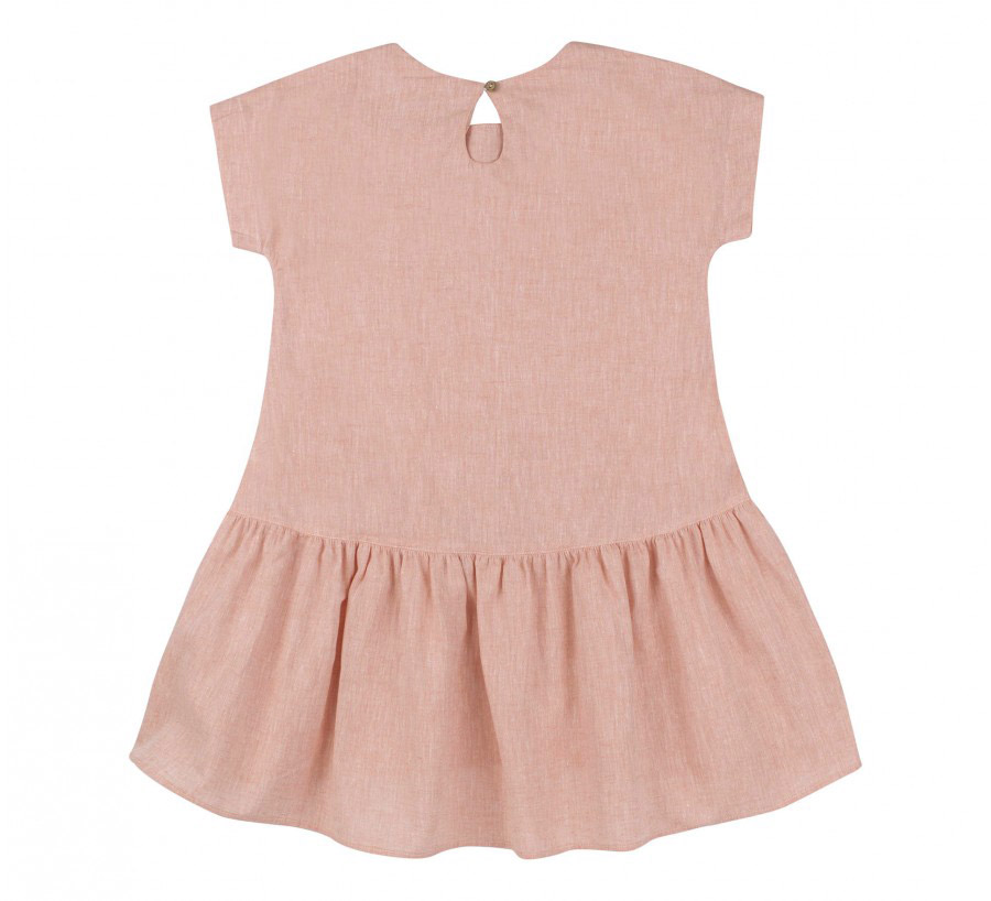 Однотонна сукня абрикосового кольору. Модель з короткими рукавами та круглою горловиною, ззаду на спинці застібається на гудзик. Сукня виготовлена з лляної тканини. Матеріал легкий, приємний, забезпечить дитині максимальний комфорт та затишок. Сукня з льону - це ідеальне рішення для повсякденного носіння влітку, модель поєднує комфорт та практичність.