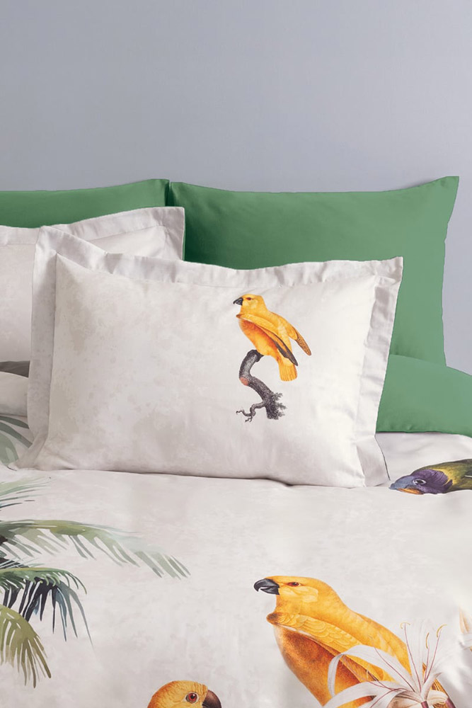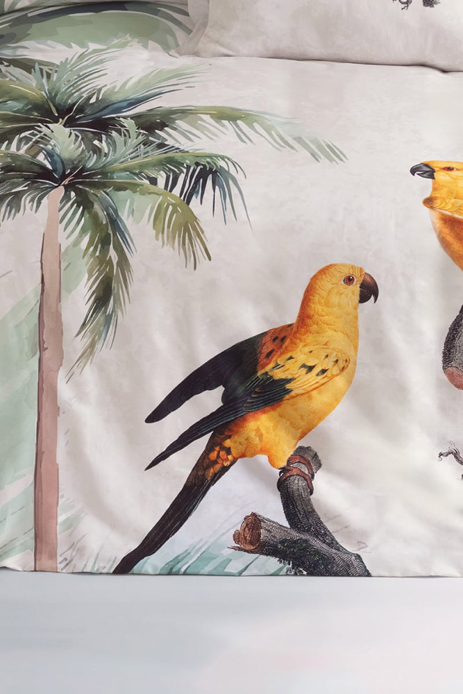Комплект Leroy з красивим тропічним принтом з птахами і пальмами, наповнить вашу спальню легкістю і гармонією, освіжаючи простір і створюючи затишну атмосферу. Комплект виконаний з якісної сатинової тканини. Матеріал з натуральної бавовни гладкий і ніжний на дотик, м'який і шовковистий, забезпечує максимально комфортний сон, забезпечує тривалий термін служби.