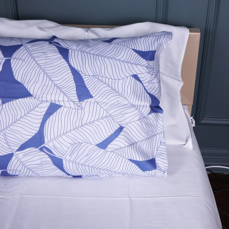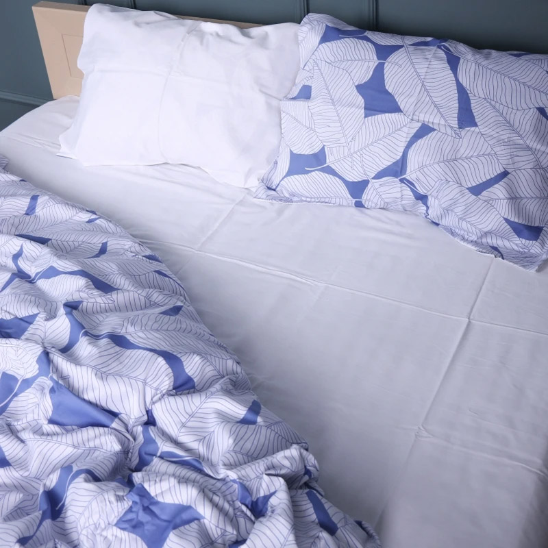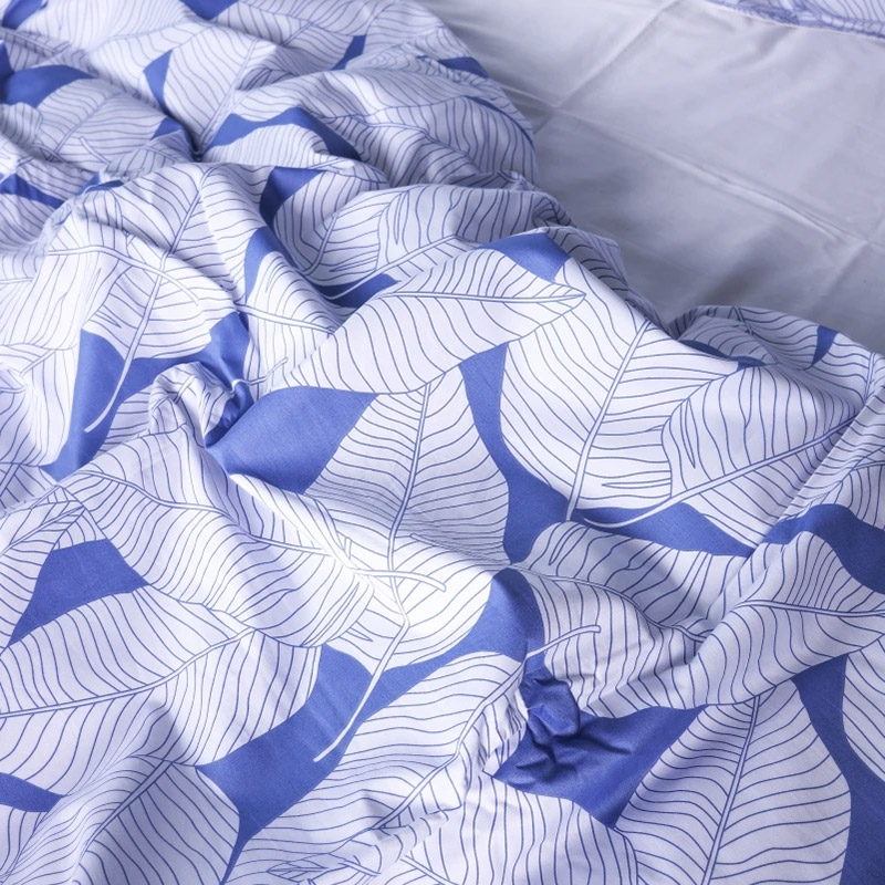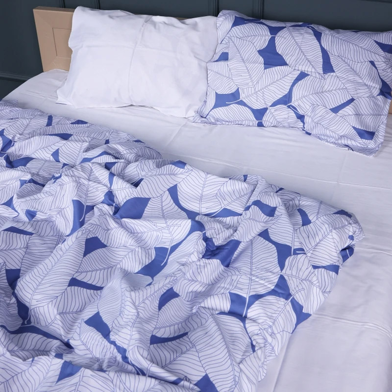 Сатиновий комплект у біло-синій гамі з красивим рослинним принтом із листям. Постільна білизна чудово доповнить інтер'єр і зробить спальню більш затишною. Якісна тканина з натуральної бавовни ніжна і м'яка на дотик, з гладкою фактурою, забезпечує максимально комфортний і приємний сон.