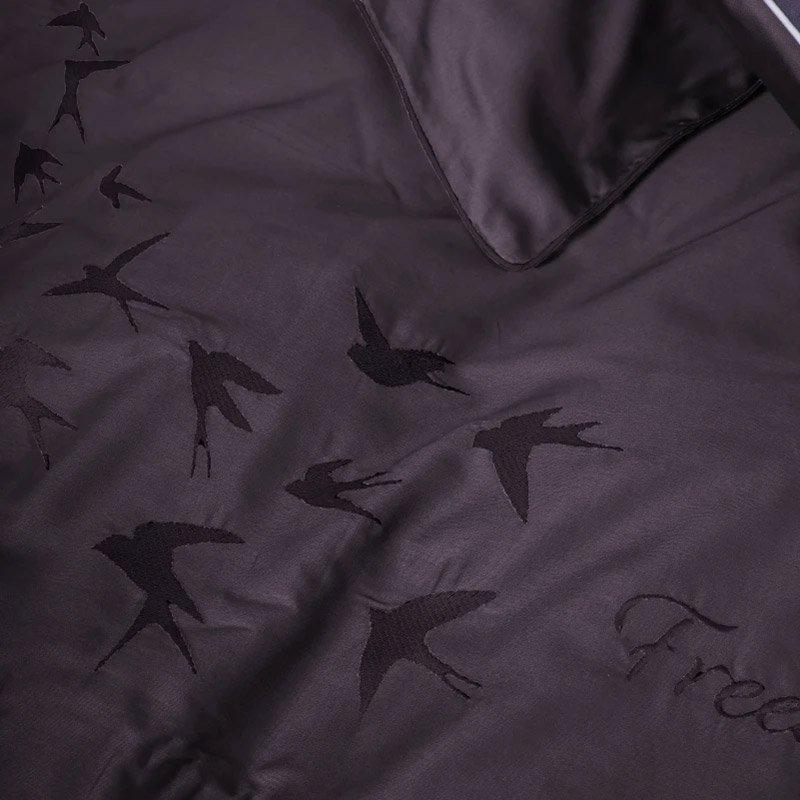 Постільна білизна преміум-класу з високоякісного італійського сатину. Комплект фіолетового кольору, декорований вишивкою (птахи, написи) і контрастним кантом. Комплект стане родзинкою спальні, зробить кімнату більш затишною і неповторною. М'яка і шовковиста тканина з натуральної бавовни забезпечить максимально комфортний і приємний сон.