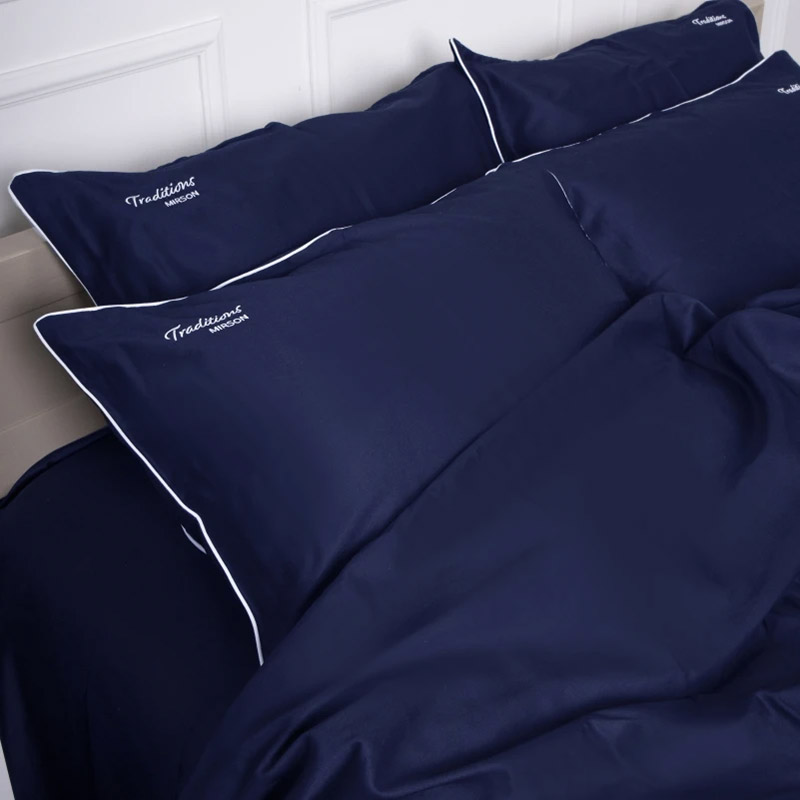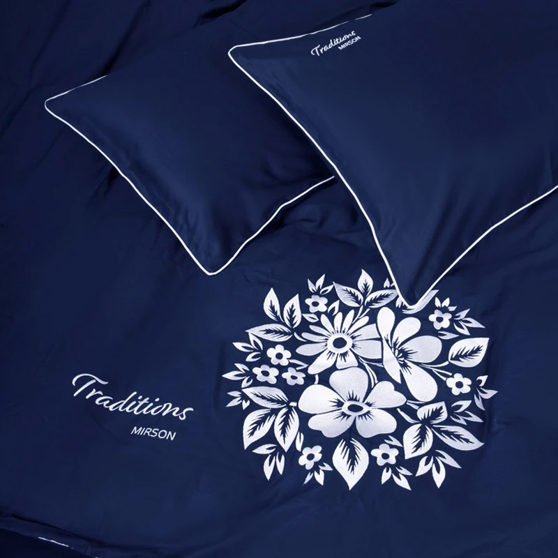 Постільна білизна преміум-класу з високоякісного італійського сатину. Комплект темно-синього кольору, декорований вишивкою (квіти, написи) і контрастним білим кантом. Комплект стане родзинкою спальні, зробить кімнату більш затишною і неповторною. М'яка і шовковиста тканина з натуральної бавовни забезпечить максимально комфортний і приємний сон.