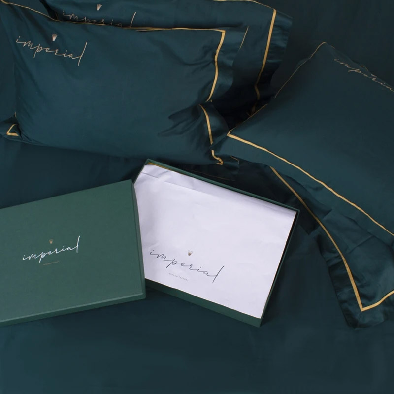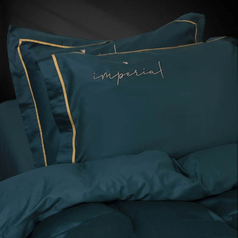 Ексклюзивна постільна білизна преміум-класу з високоякісного італійського сатину класу Luxе, до складу якого входить 5% шовкової нитки і 95% єгипетської високоякісної бавовни. Розкішний комплект смарагдового кольору, декорований вишивкою (корона, напис Imperial) і контрастним кантом. Комплект стане королівським акцентом у спальні. М'яка і шовковиста тканина забезпечить максимально комфортний і приємний сон.
