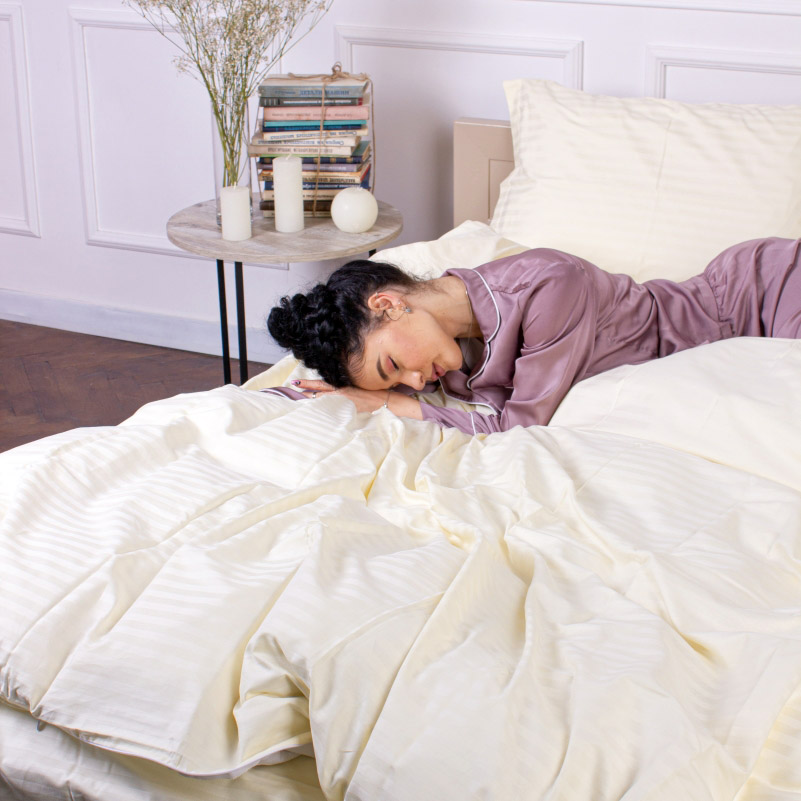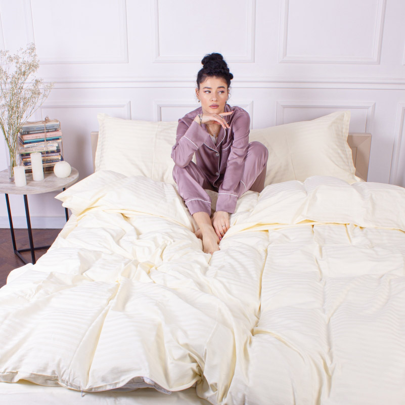 Однотонна сатинова підковдра ніжного жовтого кольору з гарними жакардовими смужками. Підковдра чудово доповнить сучасний інтер'єр. Підковдра виконана з м'якого якісного сатину, оснащена зручною застібкою-блискавкою. Ніжна та шовковиста тканина з натуральної бавовни забезпечить максимально комфортний та приємний сон.