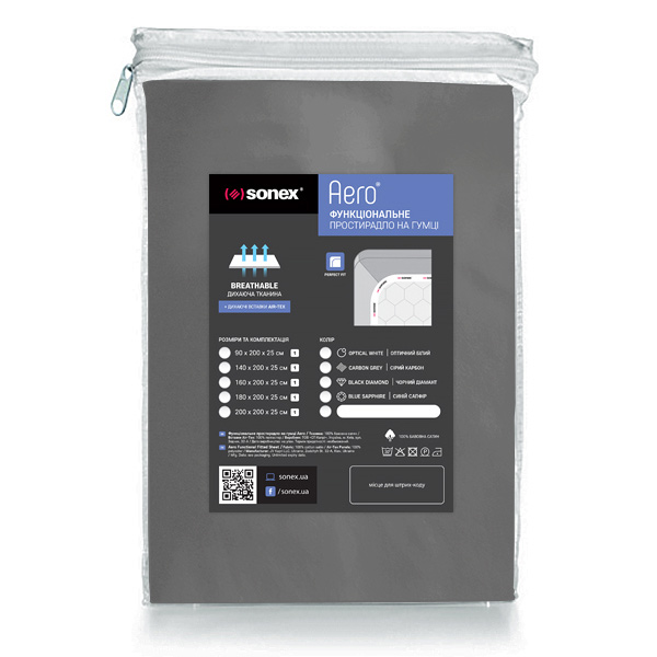 Простирадло на гумці сатинова Aero Carbon Grey Sonex. Функціональне простирадло на гумці допоможе Вам спати з комфортом у будь-яку пору року. Спеціальні вставки Air-Tex забезпечують вільну циркуляцію повітря та відводять зайву вологу. Преміум сатин має міцну структуру та неперевершену шовковисту м'якість, він приємний на дотик і ніжний для шкіри.