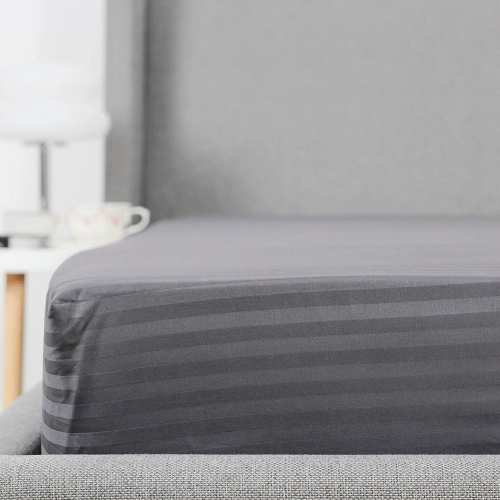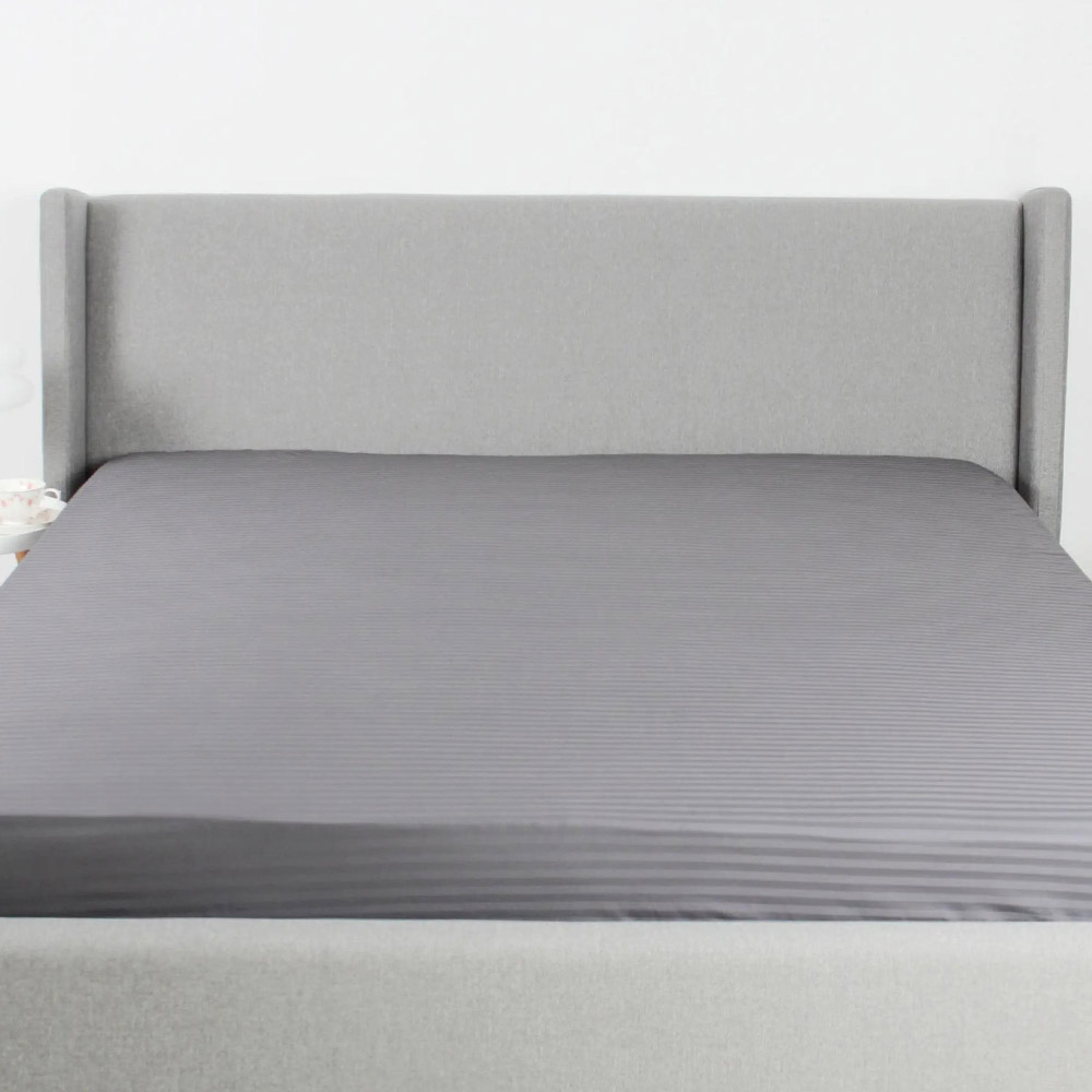 Однотонне простирадло графітового кольору з красивими жакардовими смужками. Простирадло виконане з м'якого якісного сатину. Завдяки еластичній гумці, простирадло надійно фіксується на матраці, не сповзає, не утворює складок. Тканина з натуральної бавовни ніжна на дотик, прекрасно пропускає повітря, дарує максимально комфортний і приємний сон.