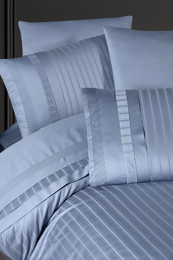 Однотонний сатиновий комплект блакитного кольору із гарними жакардовими смужками. Постільна білизна чудово доповнить інтер'єр, стане стильним акцентом у спальні. Комплект виконаний із високоякісної сатинової тканини класу люкс. Матеріал з натуральної бавовни, з шовковистою та гладкою поверхнею, м'який та ніжний на дотик, забезпечує максимально комфортний сон.