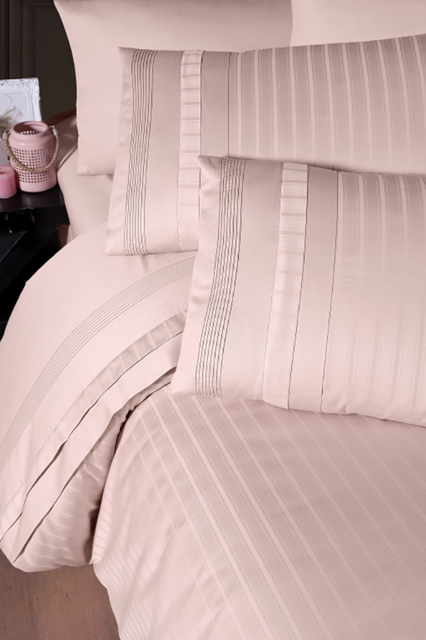 Однотонний сатиновий комплект ніжного рожевого кольору з гарними жакардовими смужками. Постільна білизна чудово доповнить інтер'єр, стане елегантним акцентом у спальні. Комплект виконаний із високоякісної сатинової тканини класу люкс. Матеріал з натуральної бавовни, з шовковистою поверхнею, м'який та ніжний на дотик, забезпечує максимально комфортний сон.