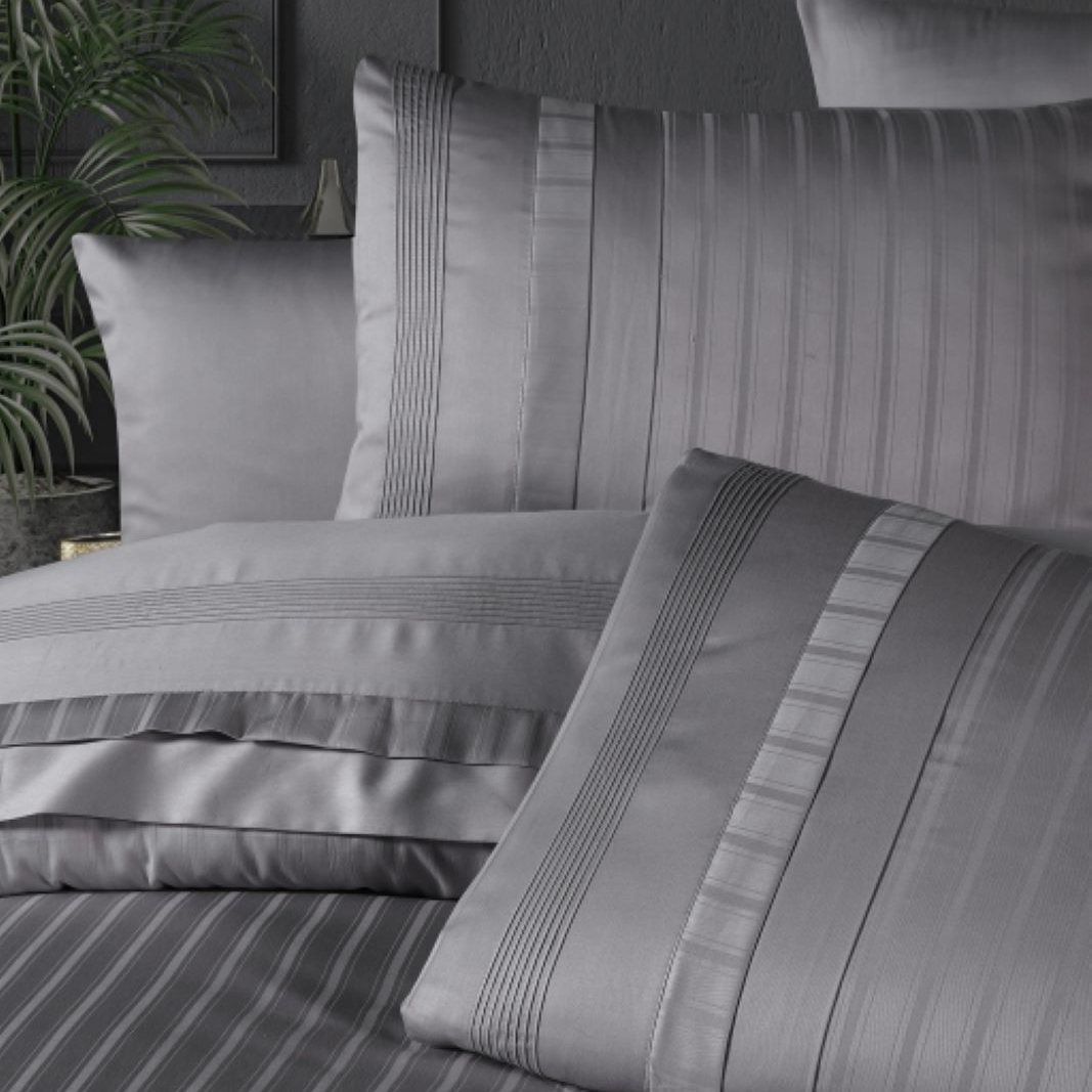 Однотонний сатиновий комплект сірого відтінку з гарними жакардовими смужками. Постільна білизна чудово доповнить інтер'єр, стане стильним акцентом у спальні. Комплект виконаний із високоякісної сатинової тканини класу люкс. Матеріал з натуральної бавовни, з шовковистою та гладкою поверхнею, м'який та ніжний на дотик, забезпечує максимально комфортний сон.