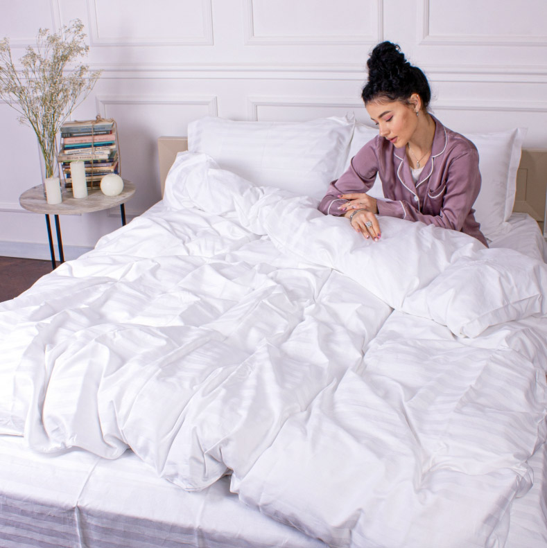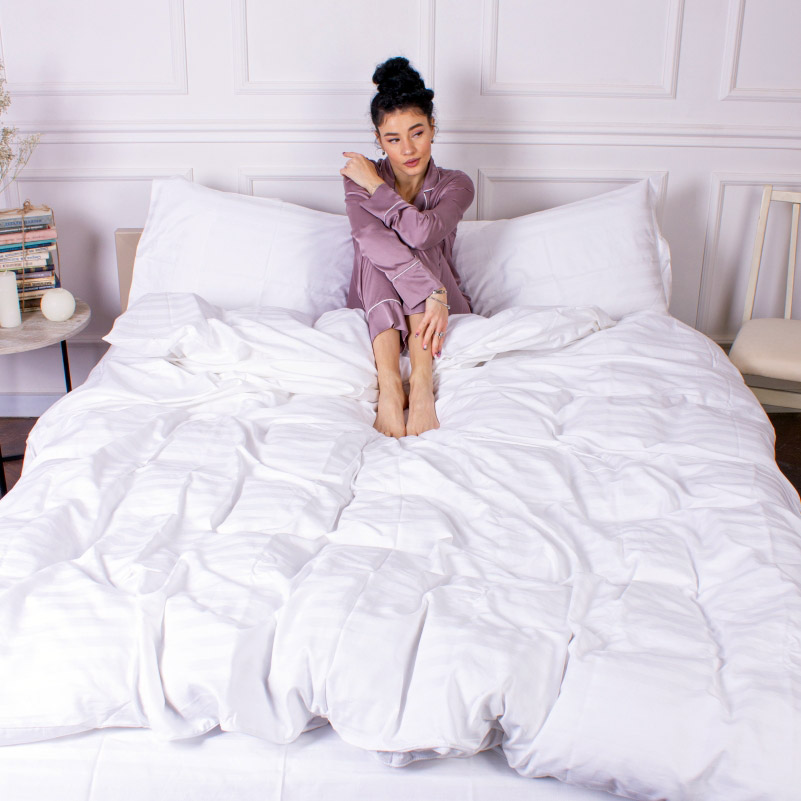 Європейська класика — однотонна постільна білизна білого кольору з гарними жакардовими смужками. Біла постіль стане універсальним рішенням для будь-якої спальні, подарує відчуття чистоти та гармонії. Комплект виконаний із м'якого високоякісного сатину. Ніжна та шовковиста тканина з натуральної бавовни забезпечить максимально комфортний та приємний сон.