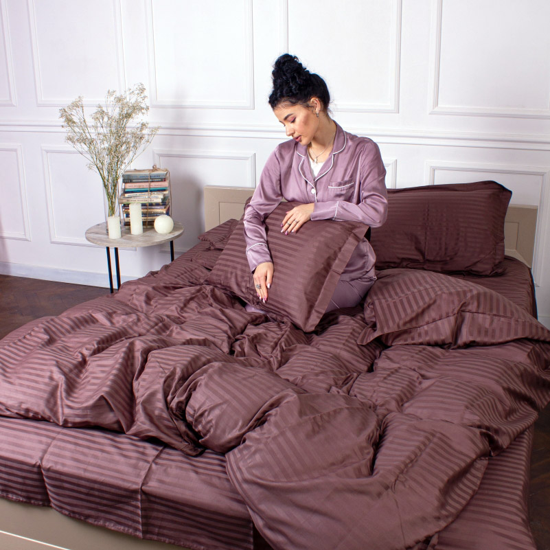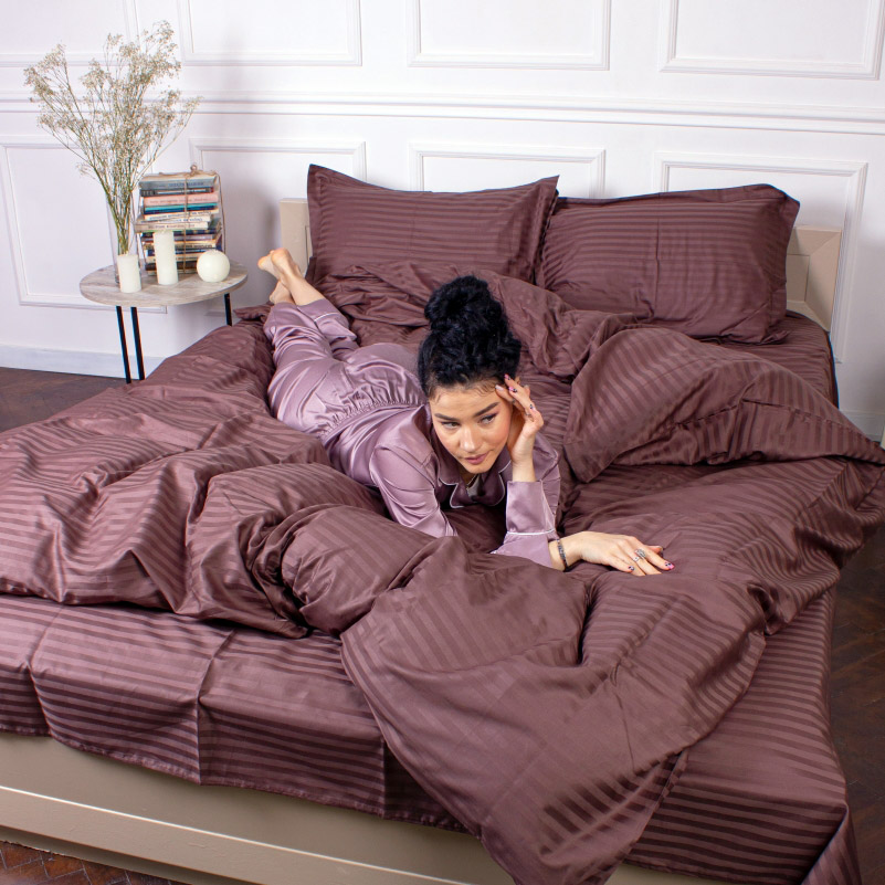 Однотонна постільна білизна шоколадного кольору з гарними жакардовими смужками. Комплект чудово доповнить інтер'єр, стане родзинкою спальні. Комплект виконаний із м'якого високоякісного сатину. Ніжна та шовковиста тканина з натуральної бавовни забезпечить максимально комфортний та приємний сон.
