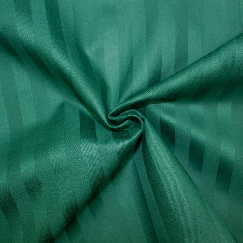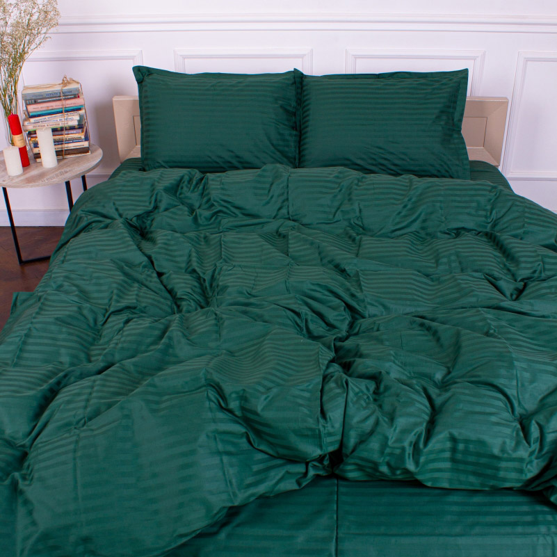 Однотонний комплект зеленогно кольору з гарними жакардовими смужками. Постільна білизна стане стильним акцентом в інтер'єрі спальні. Комплект виконаний із м'якого високоякісного сатину. Ніжна та шовковиста тканина з натуральної бавовни забезпечить максимально комфортний та приємний сон.