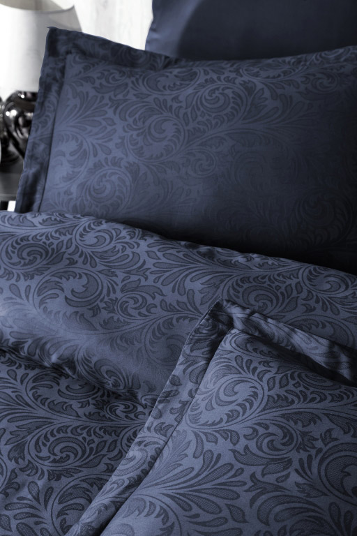 Розкішний комплект темно-синього кольору з красивим рослинним жакардовим візерунком. Комплект стане родзинкою спальні, створить в інтер'єрі неповторну атмосферу затишку і гармонії. Натуральна бавовняна тканина дозволить вам добре виспатися і відпочити.