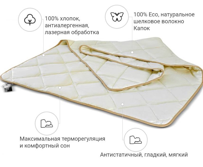 Легка літня ковдра з наповнювачем із шовку та антиалергенного шовкового волокна. Рослинний шовк капок має прекрасні терморегулюючі властивості, не парить, не викликає алергії, легкий і повітряний. Наповнювач рівномірно розподілений і простібаний по всій ковдрі. Тканина верху – натуральний бавовняний матеріал кремового кольору. Тканина м'яка і приємна на дотик, чудово пропускає повітря.