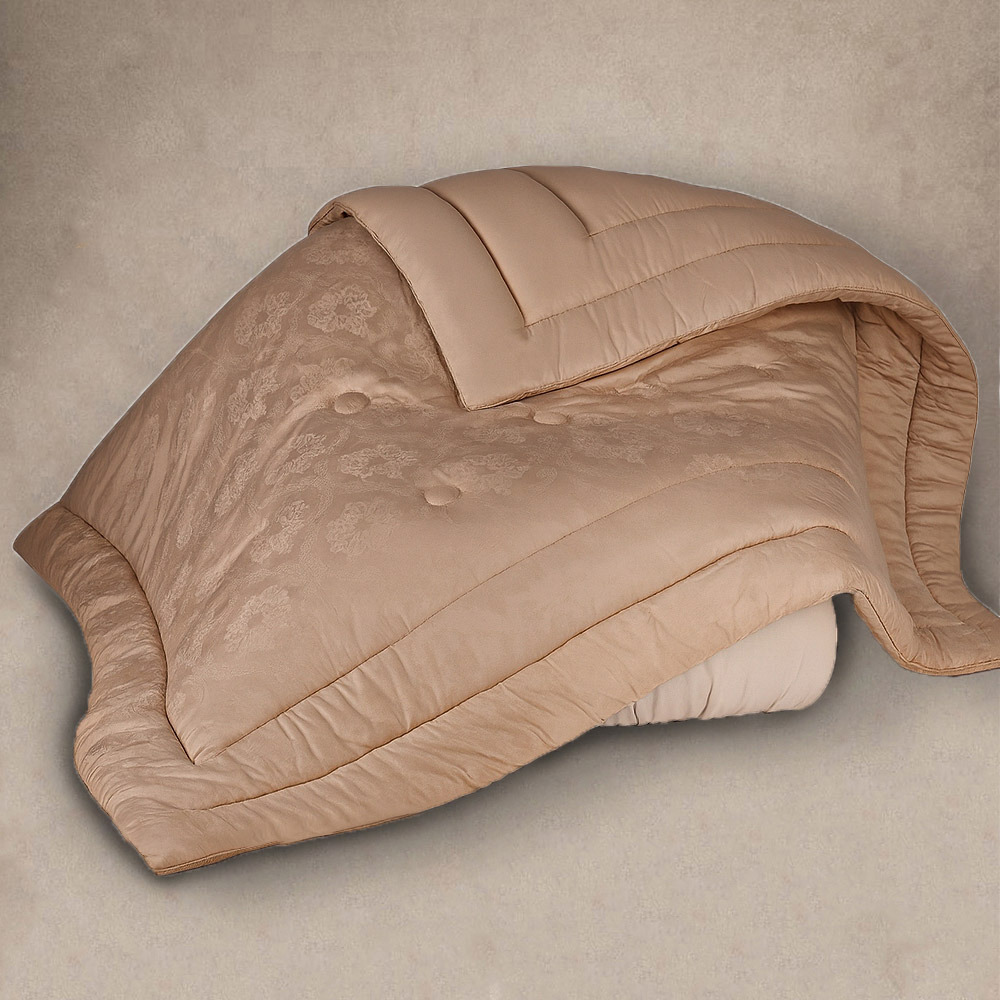 Тепла зимова ковдра з наповнювачем із шовку й антиалергенного шовкового волокна. Рослинний шовк капок має прекрасні терморегулювальні властивості, не парить, не викликає алергії, легкий і повітряний. Наповнювач рівномірно розподілений і простьобаний по всій ковдрі. Чохол ковдри виготовлений з італійського сатину золотисто-бежевого кольору з вишуканим жакардовим візерунком. Матеріал м'який і приємний на дотик, ніжний і шовковистий, прекрасно пропускає повітря.