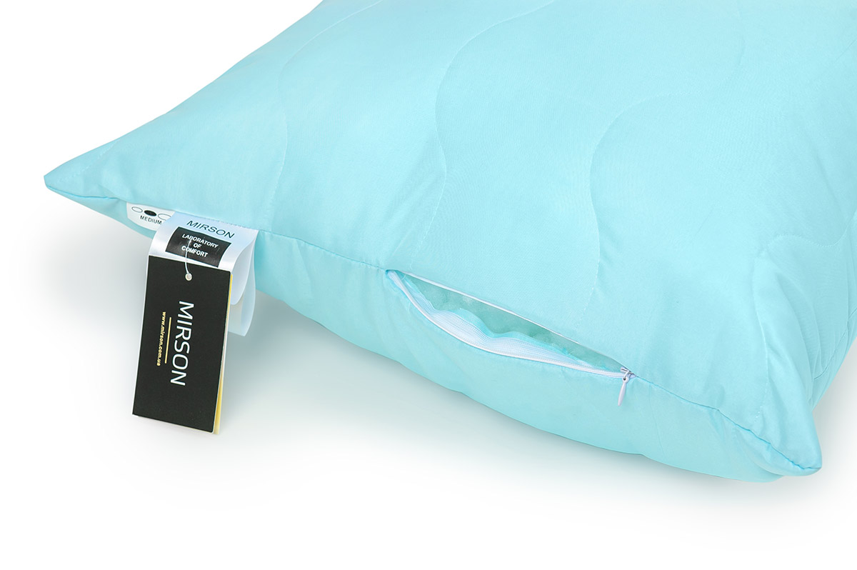 Універсальна подушка середньої висоти і м'якості з наповнювачем із шовку і антиалергенного волокна. Рослинний шовк капок має прекрасні терморегулюючіі властивості, не парить, не викликає алергії, легкий і повітряний, не збивається в процесі експлуатації. Чохол подушки стьобаний, виконаний з якісного італійського мікросатину блакитного кольору. Тканина на основі бавовни і поліефірного волокна проста в догляді, м'яка і приємна на дотик. У подушці є вбудована блискавка, завдяки якій можна відрегулювати кількість наповнювача.