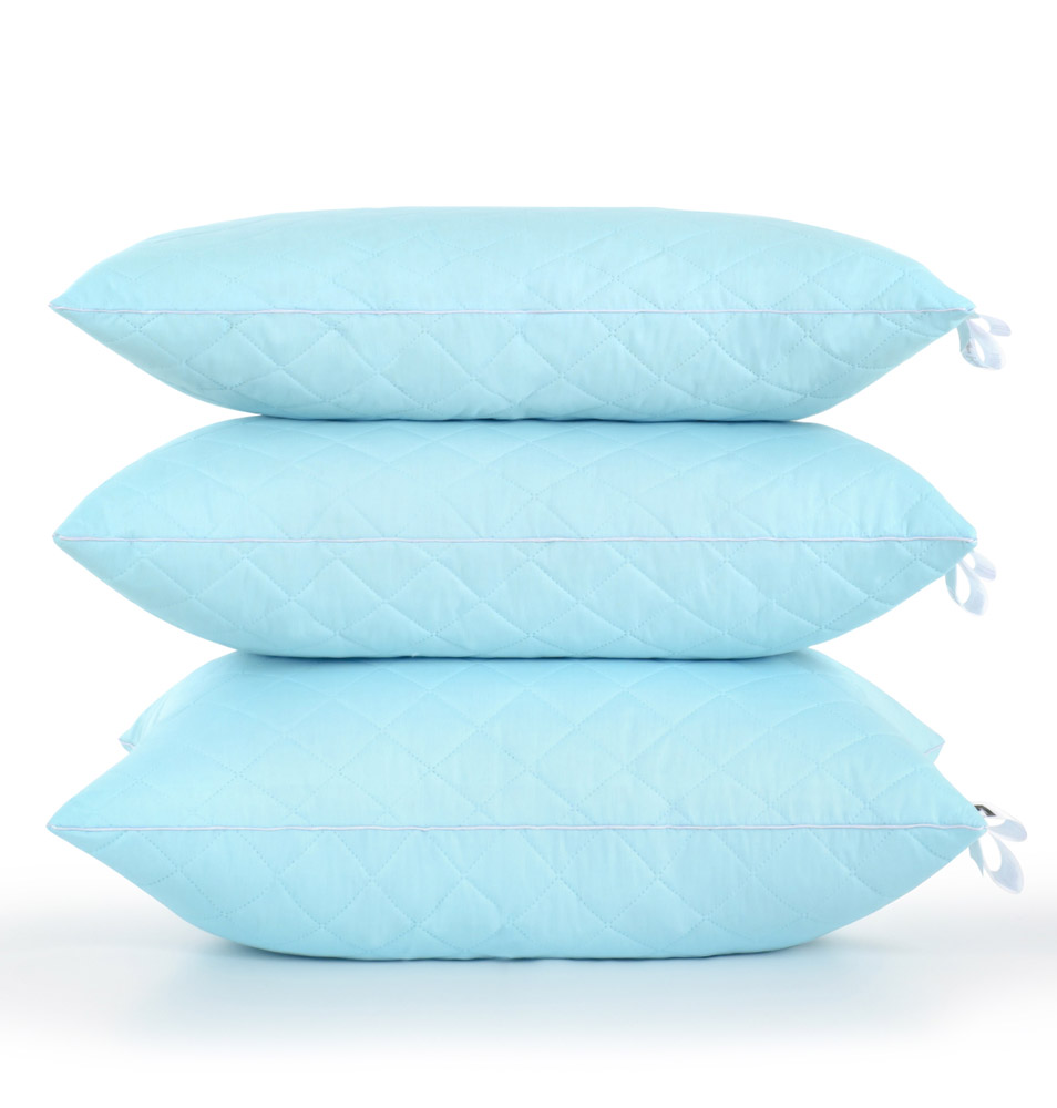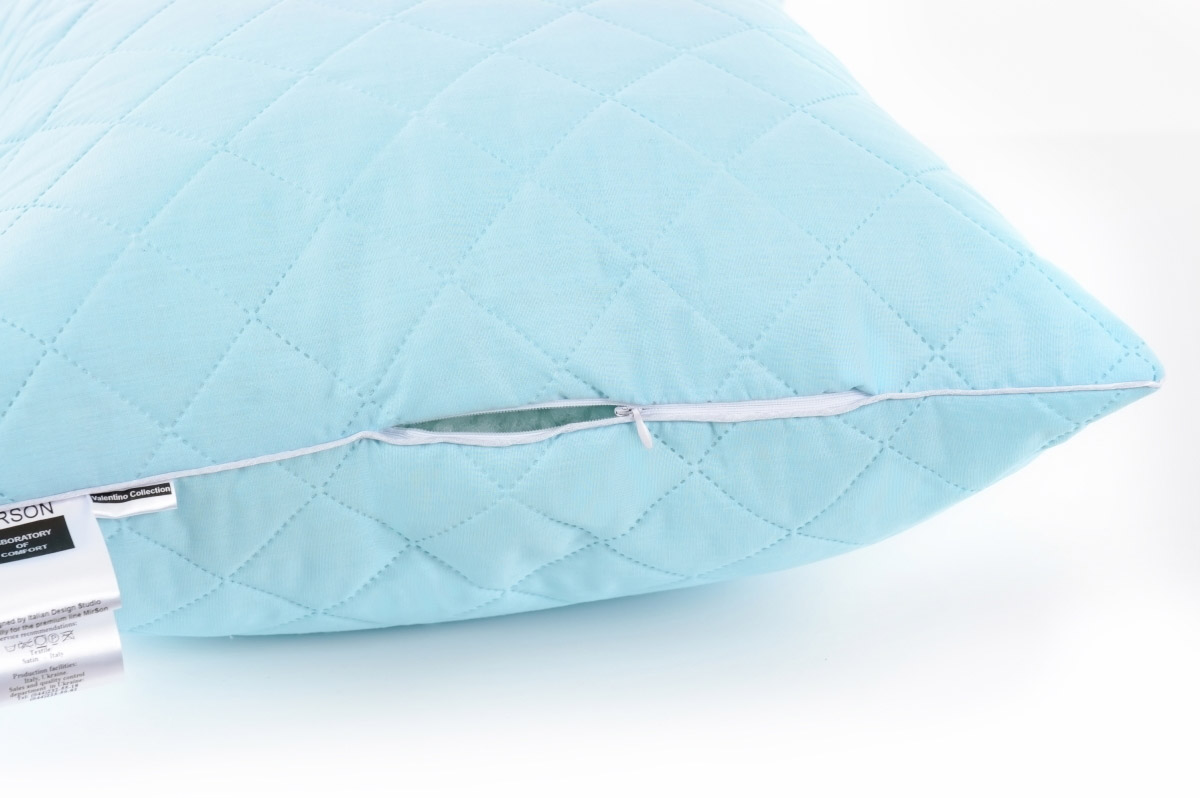 Висока і пружна подушка з наповнювачем із рослинного шовку і штучного шовкового волокна. Рослинний шовк капок має прекрасні терморегулюючі властивості, не парить, не викликає алергії, легкий і повітряний, не збивається в процесі експлуатації. Чохол подушки виконаний з натуральної бавовняної тканини блакитного кольору з лазерною обробкою і білим кантом. Матеріал щільний, приємний на дотик, виготовлений за новітньою технологією (в простібці відсутні нитки), при якій полотно стає більш міцним і зносостійким. У подушці є вбудована блискавка, завдяки якій можна відрегулювати кількість наповнювача.